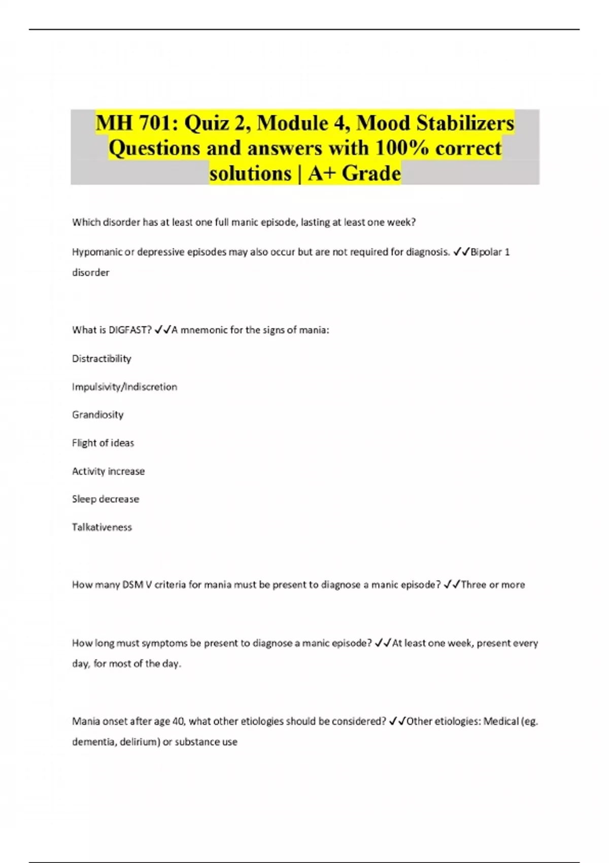 MH 701: Quiz 2, Module 4, Mood Stabilizers Questions and answers with 100% correct solutions | A+ Grade