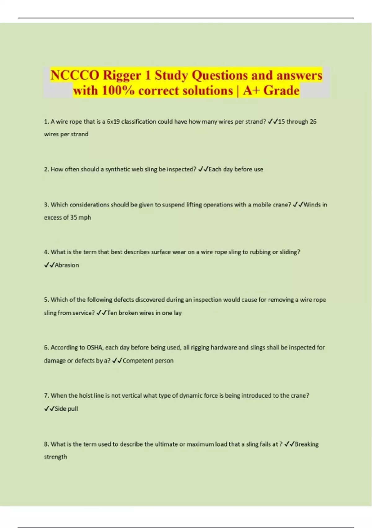 NCCCO Rigger 1 Study Questions and answers with 100% correct solutions | A+ Grade