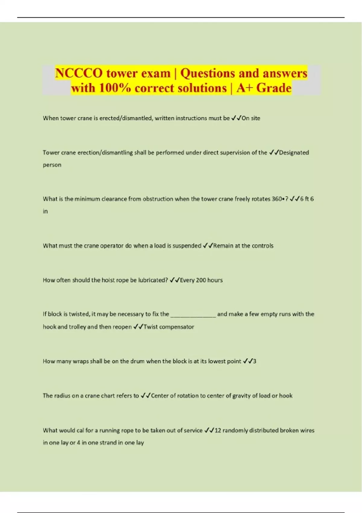 NCCCO tower exam | Questions and answers with 100% correct solutions | A+ Grade