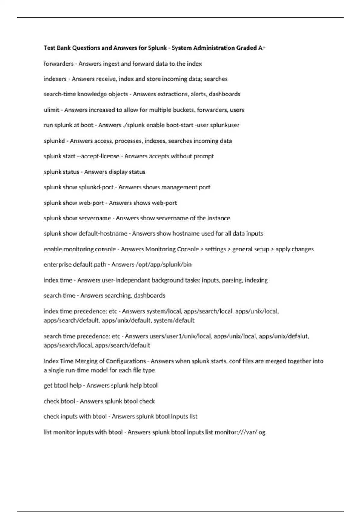 Test Bank Questions and Answers for Splunk - System Administration Graded A+ forwarders - Answers ingest and forward data to the index indexers - Answers receive, index and store incoming data; searches search-time knowledge objects - Answers extractions, alerts, dashboards ulimit - Answers increased to allow for multiple buckets, forwarders, users run splunk at boot - Answers ./splunk enable boot-start -user splunkuser splunkd - Answers access, processes, indexes, searches incoming data splunk start --accept-license - Answers accepts without prompt splunk status - Answers display status splunk show splunkd-port - Answers shows management port splunk show web-port - Answers shows web-port splunk show servername - Answers show servername of the instance splunk show default-hostname - Answers show hostname used for all data inputs enable monitoring console - Answers Monitoring Console > settings > general setup > apply changes enterprise default path - Answers /opt/app/splunk/bin index time - Answers user-independant background tasks: inputs, parsing, indexing search time - Answers searching, dashboards index time precedence: etc - Answers system/local, apps/search/local, apps/unix/local, apps/search/default, apps/unix/default, system/default search time precedence: etc - Answers users/user1/unix/local, apps/unix/local, apps/unix/defalut, apps/search/local, apps/search/default Index Time Merging of Configurations - Answers when splunk starts, conf files are merged together into a single run-time model for each file type get btool help - Answers splunk help btool check btool - Answers splunk btool check check inputs with btool - Answers splunk btool inputs list list monitor inputs with btool - Answers splunk btool inputs list monitor:///var/log debug monitor inputs with btool - Answers splunk btool inputs list monitor:///var/log/ --debug restart splunk - Answers splunk restart debug tags with btool - Answers splunk btool tags list --debug list tags with btool for user1 in search - Answers splunk btool tags list --debug --user=user1 --app=search preconfigured indexes: _internal - Answers splunks own logs and metrics preconfigured indexes: _audit - Answers audit trails preconfigured indexes: _introspection - Answers tracks system performance and usage data preconfigured indexes: _thefishbucket - Answers contains checkpoint information for file monitoring inputs preconfigured indexes: summary - Answers default index for summary indexing preconfigured indexes: main - Answers default index for inputs, located in defaultdb how to apply access controls - Answers segregate events into separate indexes to limit access by splunk role how to apply retention policies - Answers separate events into different indexes based on desired retention time bucket - Answers a directory containing a set of rawdata and indexing data path to buckets - Answers $splunk$/var/lib/splunk/defaultdb/* hot bucket - Answers open for writes, readable warm bucket - Answers recent data, read only cold bucket - Answers oldest data in the index, read only frozen bucket - Answers deletion is default action; if frozen path is defined the data is archived, but not searchable read bucket files: youngest event: db___5 - Answers read bucket files: oldest event: db___5 - Answers read bucket files: unique ID: db___5 - Answers 5
