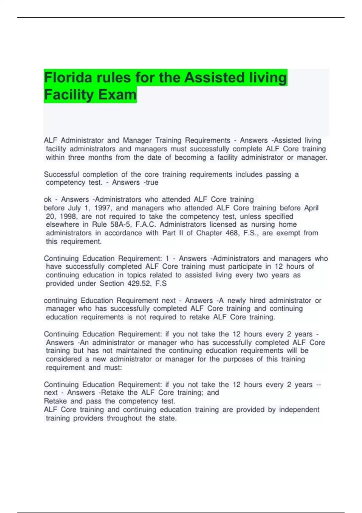 Florida rules for the Assisted living Facility Exam