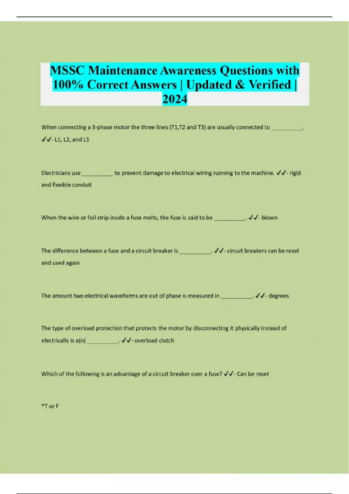 MSSC Maintenance Awareness Questions with 100% Correct Answers | Updated & Verified | 2024