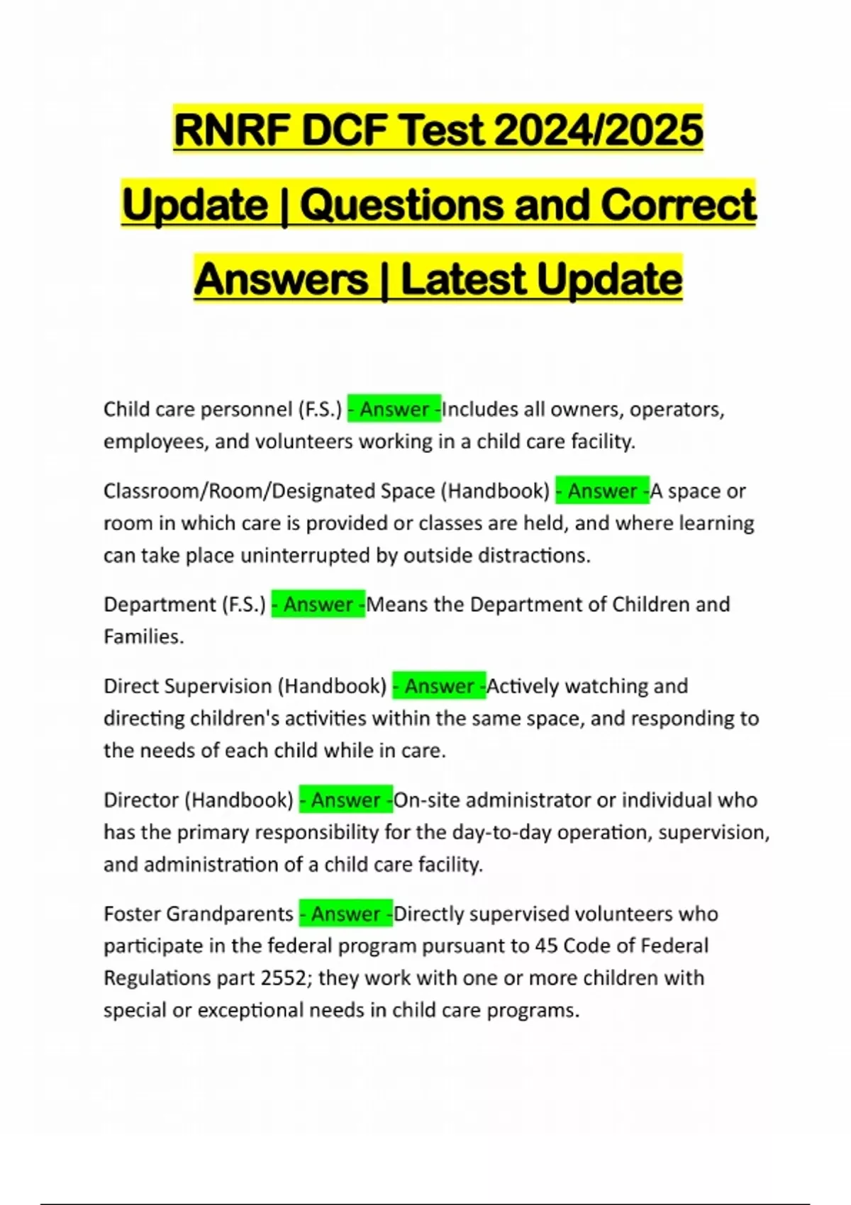 RNRF DCF Test 2024/2025 Update | Questions and Correct Answers | Latest Update Child care personnel (F.S.) - Answer -Includes all owners, operators, employees, and volunteers working in a child care facility. Classroom/Room/Designated Space (Handbook) - Answer -A space or room in which care is provided or classes are held, and where learning can take place uninterrupted by outside distractions. Department (F.S.) - Answer -Means the Department of Children and Families. Direct Supervision (Handbook) - Answer -Actively watching and directing children's activities within the same space,