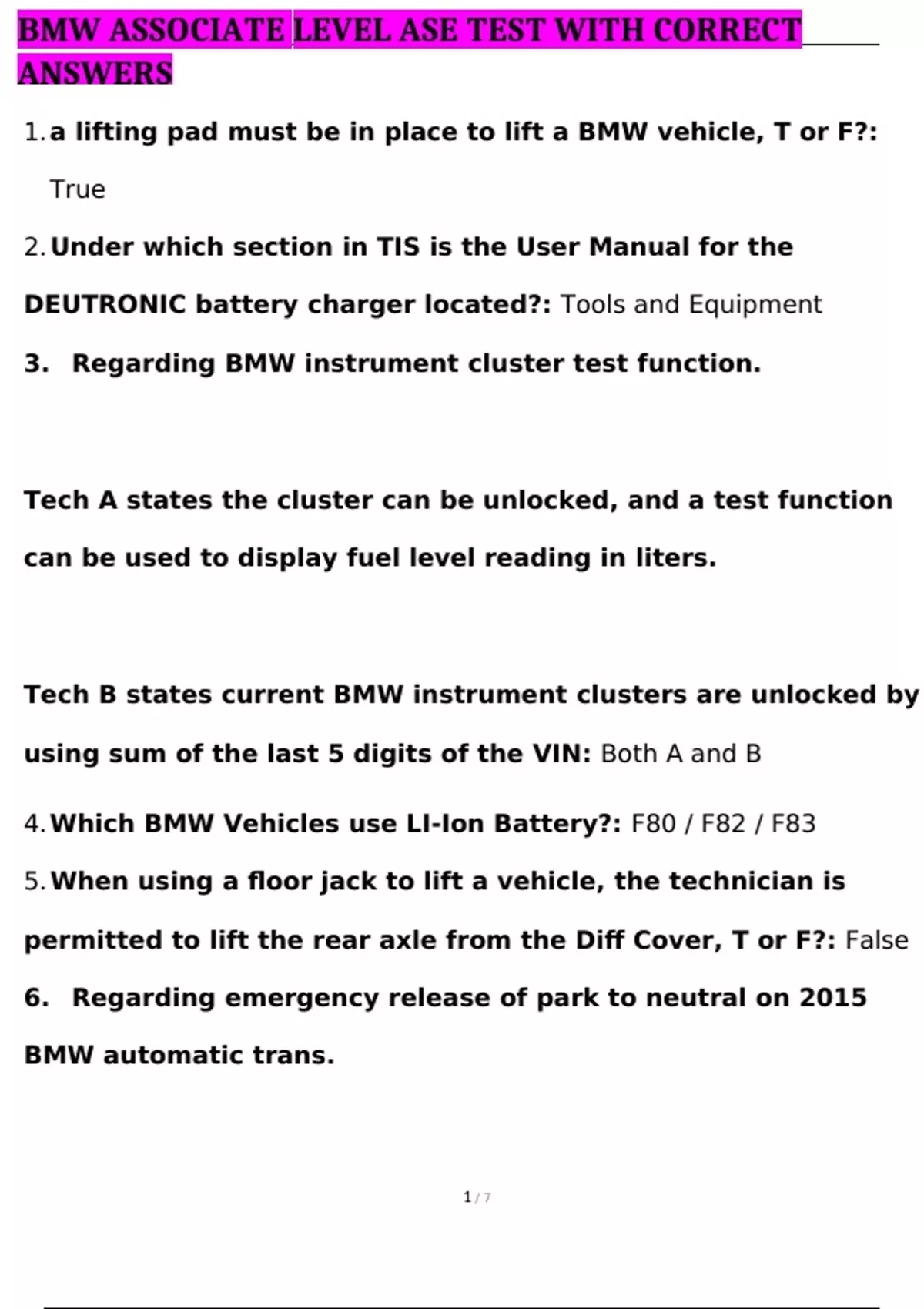 BMW ASSOCIATE LEVEL ASE TEST WITH CORRECT ANSWERS 1. a lifting pad must be in place to lift a BMW vehicle, T or F?: True 2. Under which section in TIS is the User Manual for the DEUTRONIC battery charger located?: Tools and Equipment 3. Regarding BMW instrument cluster test function. Tech A states the cluster can be unlocked, and a test function can be used to display fuel level reading in liters.