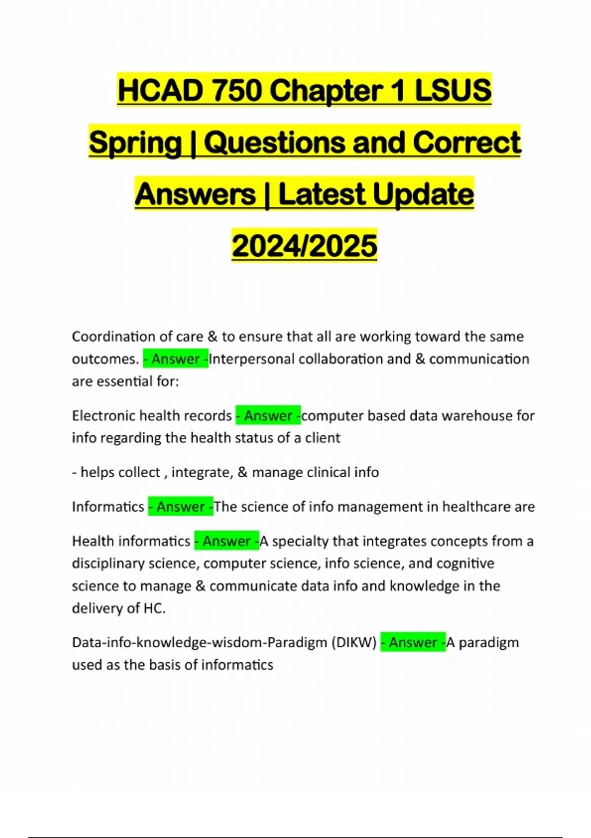HCAD 750 Chapter 1 LSUS Spring | Questions and Correct Answers | Latest Update 2024/2025 Coordination of care & to ensure that all are working toward the same outcomes. - Answer -Interpersonal collaboration and & communication are essential for: Electronic health records - Answer -computer based data warehouse for info regarding the health status of a client - helps collect , integrate, & manage clinical info Informatics - Answer -The science of info management in healthcare are Health informatics - Answer -A specialty that integrates concepts from a disciplinary science, computer science, info science, and cognitive science to manage & communicate data info and knowledge in the delivery of HC. Data-info-knowledge-wisdom-Paradigm (DIKW) - Answer -A paradigm used as the basis of informaticsFoundations of Knowledge Model - Answer -Model proposing that humans are organic info systems Data - Answer -Raw facts