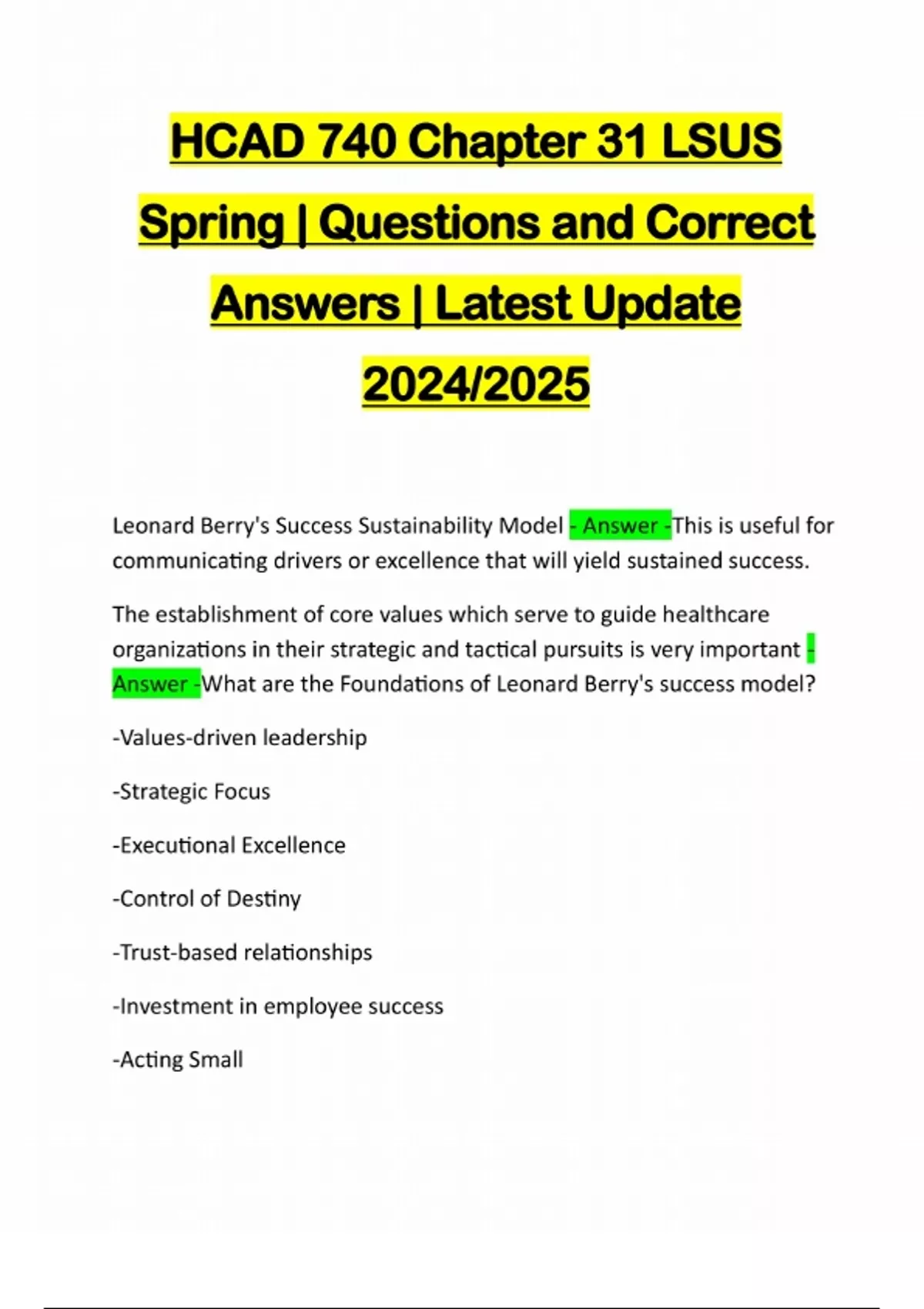 HCAD 740 Chapter 31 LSUS Spring | Questions and Correct Answers | Latest Update 2024/2025 Leonard Berry's Success Sustainability Model - Answer -This is useful for communicating drivers or excellence that will yield sustained success. The establishment of core values which serve to guide healthcare organizations in their strategic and tactical pursuits is very important - Answer -What are the Foundations of Leonard Berry's success model? -Values-driven leadership -Strategic Focus