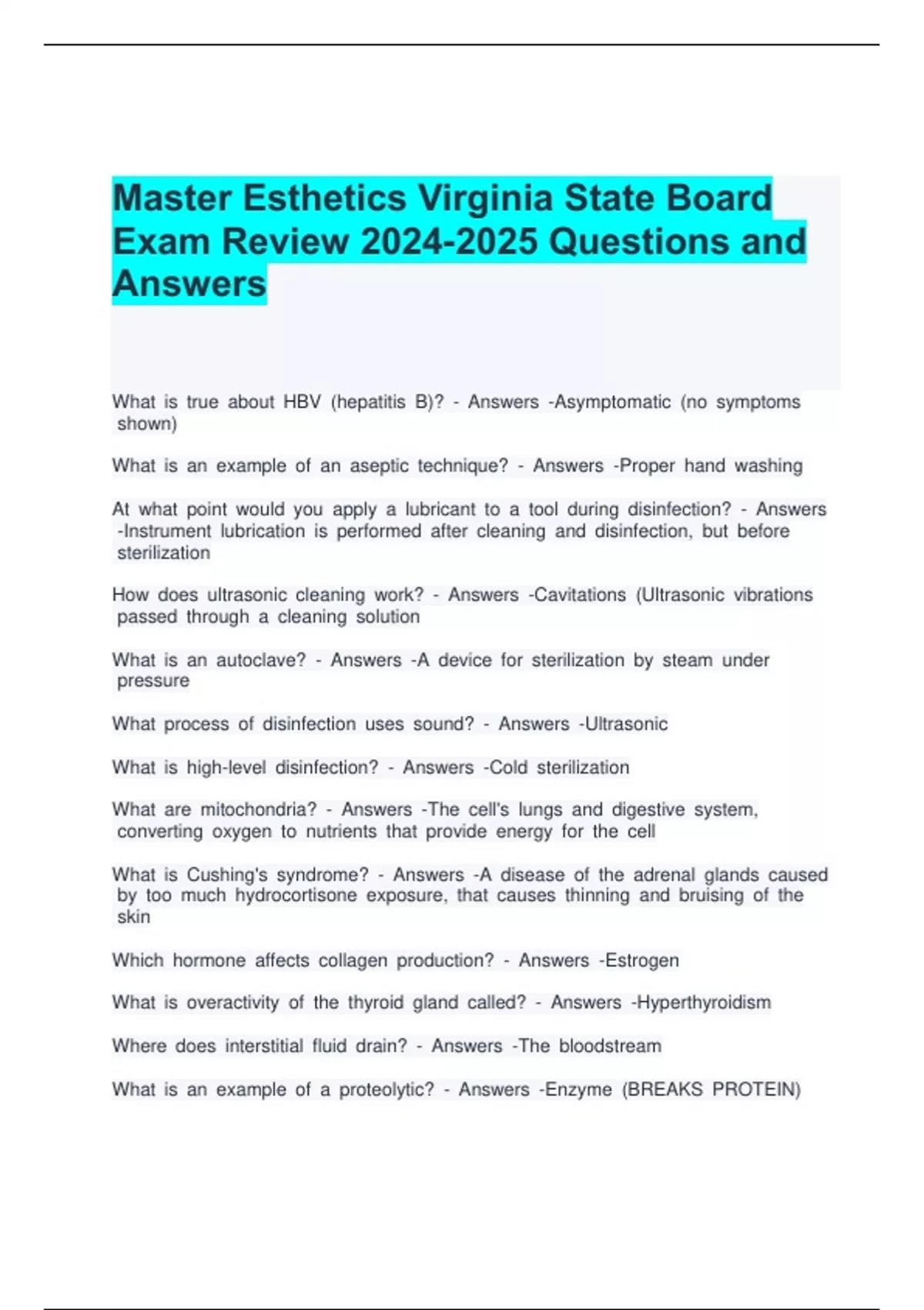 Master Esthetics Virginia State Board Exam Review Questions and Answers