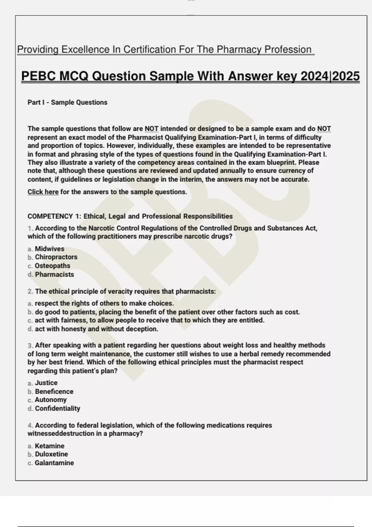 PEBC MCQ Question Sample With Answer key 2024|2025