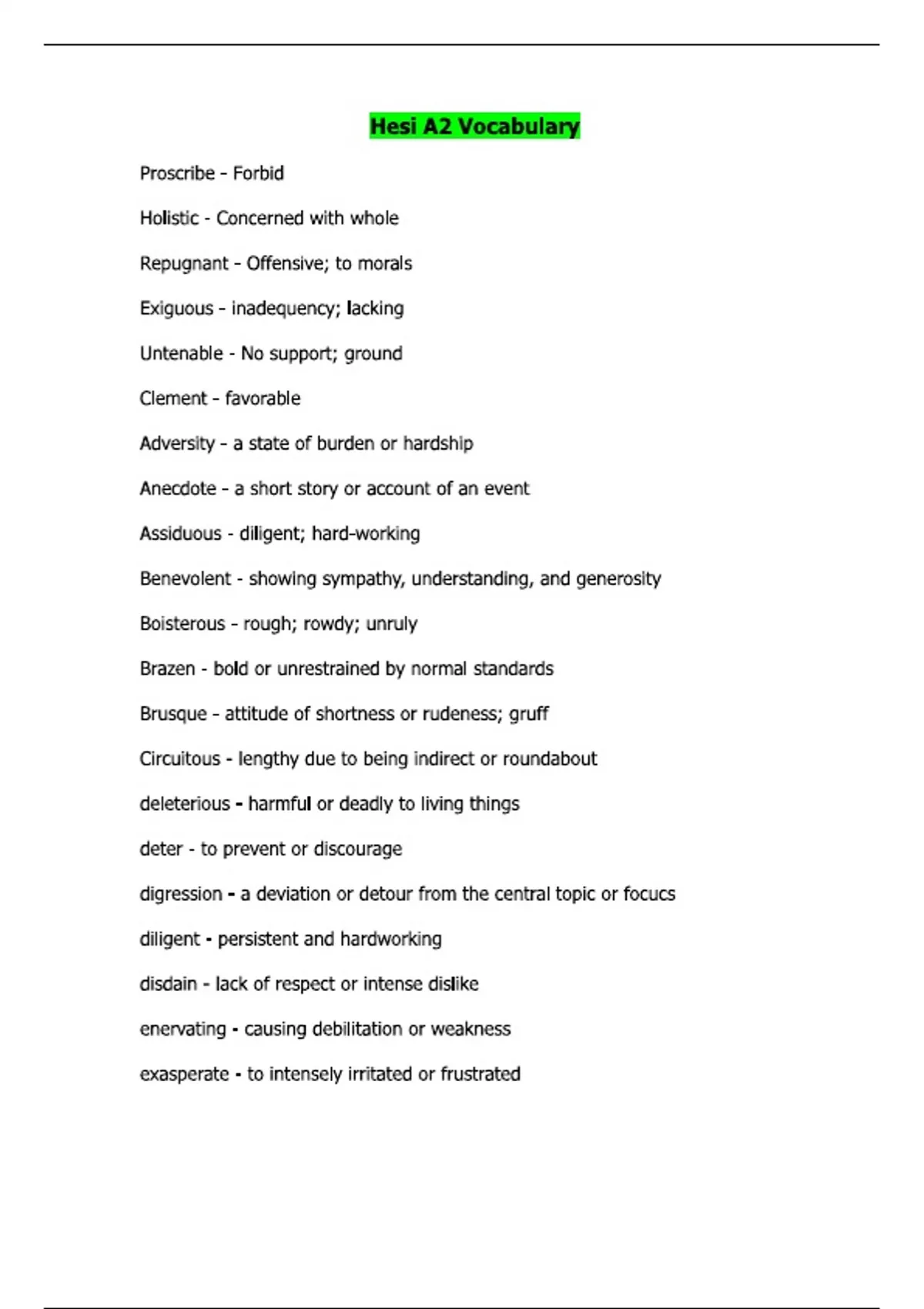 Hesi A2 Vocabulary Proscribe - Forbid Holistic - Concerned with whole Repugnant - Offensive; to morals Exiguous - inadequency; lacking Untenable - No support; ground Clement - favorable Adversity - a state of burden or hardship Anecdote - a short story or account of an event Assiduous - diligent; hard-working Benevolent - showing sympathy, understanding, and generosity Boisterous - rough; rowdy; unruly Brazen - bold or unrestrained by normal standards Brusque - attitude of shortness or rudeness; gruff Circuitous - lengthy due to being indirect or roundabout deleterious - harmful or deadly to living things deter - to prevent or discourage digression - a deviation or detour from the central topic or focucs diligent - persistent and hardworking disdain - lack of respect or intense dislike enervating - causing debilitation or weakness exasperate - to intensely irritated or frustrated