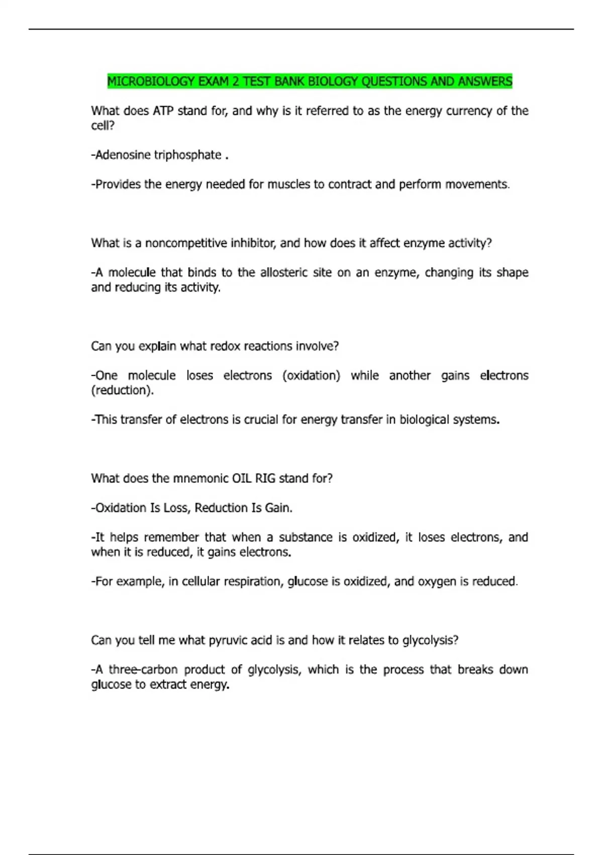 MICROBIOLOGY EXAM 2 TEST BANK BIOLOGY QUESTIONS AND ANSWERS What does ATP stand for, and why is it referred to as the energy currency of the cell? -Adenosine triphosphate . -Provides the energy needed for muscles to contract and perform movements. What is a noncompetitive inhibitor, and how does it affect enzyme activity? -A molecule that binds to the allosteric site on an enzyme, changing its shape and reducing its activity. Can you explain what redox reactions involve? -One molecule loses electrons (oxidation) while another gains electrons (reduction). -This transfer of electrons is crucial for energy transfer in biological systems. What does the mnemonic OIL RIG stand for? -Oxidation Is Loss, Reduction Is Gain. -It helps remember that when a substance is oxidized, it loses electrons, and when it is reduced, it gains electrons. -For example, in cellular respiration, glucose is oxidized, and oxygen is reduced. Can you tell me what pyruvic acid is and how it relates to glycolysis? -A three-carbon product of glycolysis, which is the process that breaks down glucose to extract energy. -For example, after glycolysis, glucose is converted into pyruvic acid, which can then enter the Krebs cycle for further energy production. What is the role of the electron transport chain in cellular respiration? -It is the final step in cellular respiration, where most of the ATP is generated through a series of protein complexes that pump protons across a membrane, creating a gradient. -For example, in mitochondria, the electron transport chain uses electrons from NADH and FADH2 to produce ATP efficiently.
