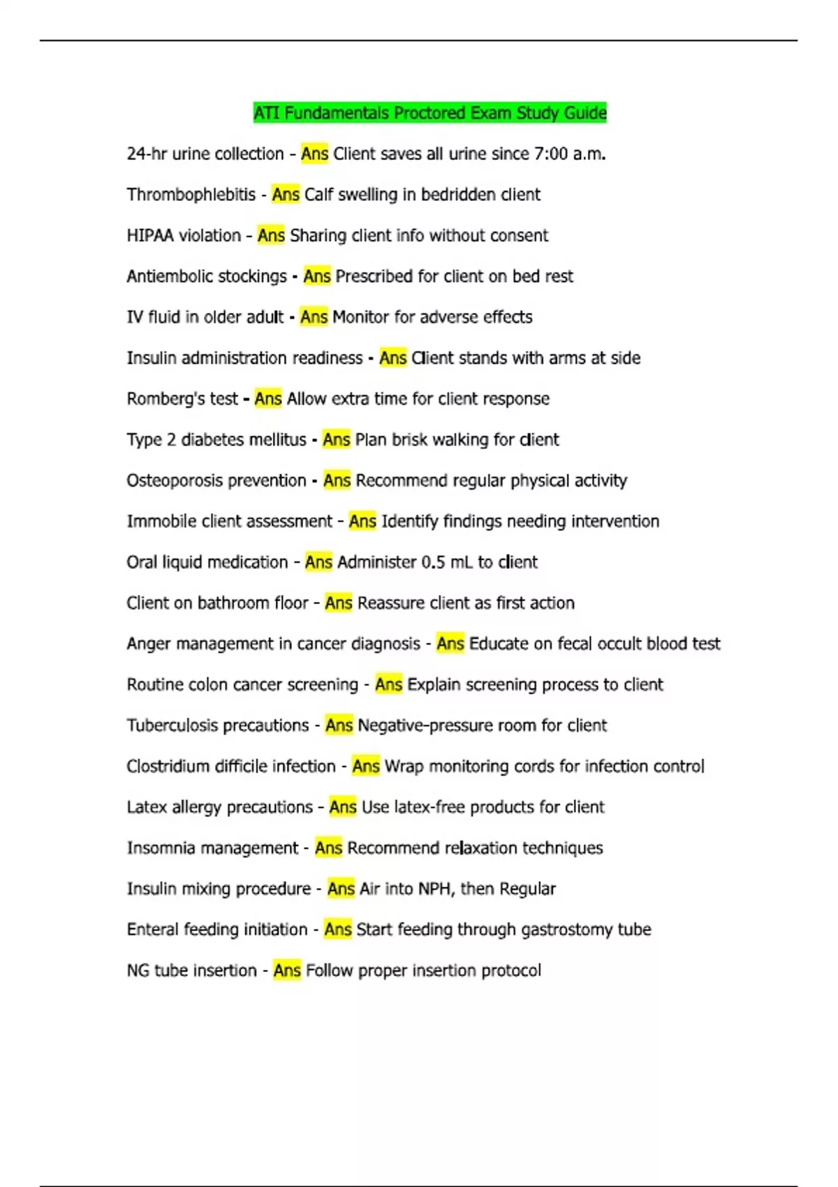 ATI Fundamentals Proctored Exam Study Guide 24-hr urine collection - Ans Client saves all urine since 7:00 a.m. Thrombophlebitis - Ans Calf swelling in bedridden client HIPAA violation - Ans Sharing client info without consent Antiembolic stockings - Ans Prescribed for client on bed rest IV fluid in older adult - Ans Monitor for adverse effects Insulin administration readiness - Ans Client stands with arms at side Romberg's test - Ans Allow extra time for client response Type 2 diabetes mellitus - Ans Plan brisk walking for client Osteoporosis prevention - Ans Recommend regular physical activity Immobile client assessment - Ans Identify findings needing intervention Oral liquid medication - Ans Administer 0.5 mL to client Client on bathroom floor - Ans Reassure client as first action Anger management in cancer diagnosis - Ans Educate on fecal occult blood test Routine colon cancer screening - Ans Explain screening process to client Tuberculosis precautions - Ans Negative-pressure room for client Clostridium difficile infection - Ans Wrap monitoring cords for infection control Latex allergy precautions - Ans Use latex-free products for client Insomnia management - Ans Recommend relaxation techniques Insulin mixing procedure - Ans Air into NPH, then Regular Enteral feeding initiation - Ans Start feeding through gastrostomy tube NG tube insertion - Ans Follow proper insertion protocol