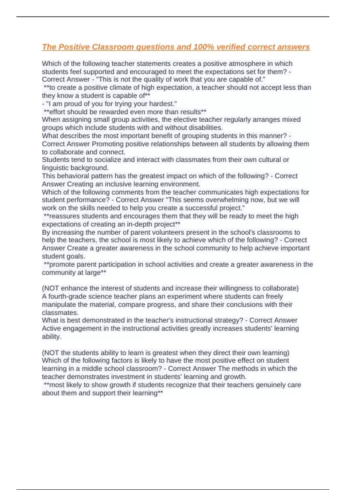 What is the primary purpose of this? - Correct Answer It cultivates a positive classroom