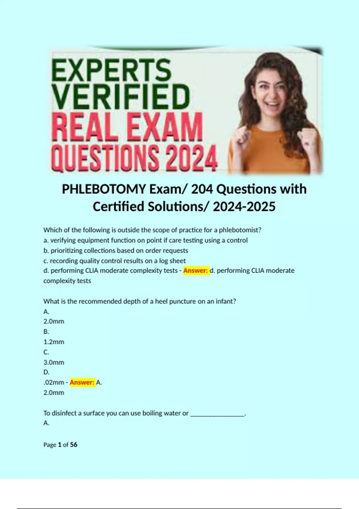 PHLEBOTOMY Exam/ 204 Questions with Certified Solutions/ Which of the following is outside the scope of practice for a phlebotomist? a. verifying equipment function on point if care testing using a control b. prioritizing collections based on order requests c. recording quality control results on a log sheet d. performing CLIA moderate complexity tests - Answer: d. performing CLIA moderate complexity tests What is the recommended depth of a heel puncture on an infant? A. 2.0mm B. 1.2mm C. 3.0mm D. .02mm - Answer: A. 2.0mm