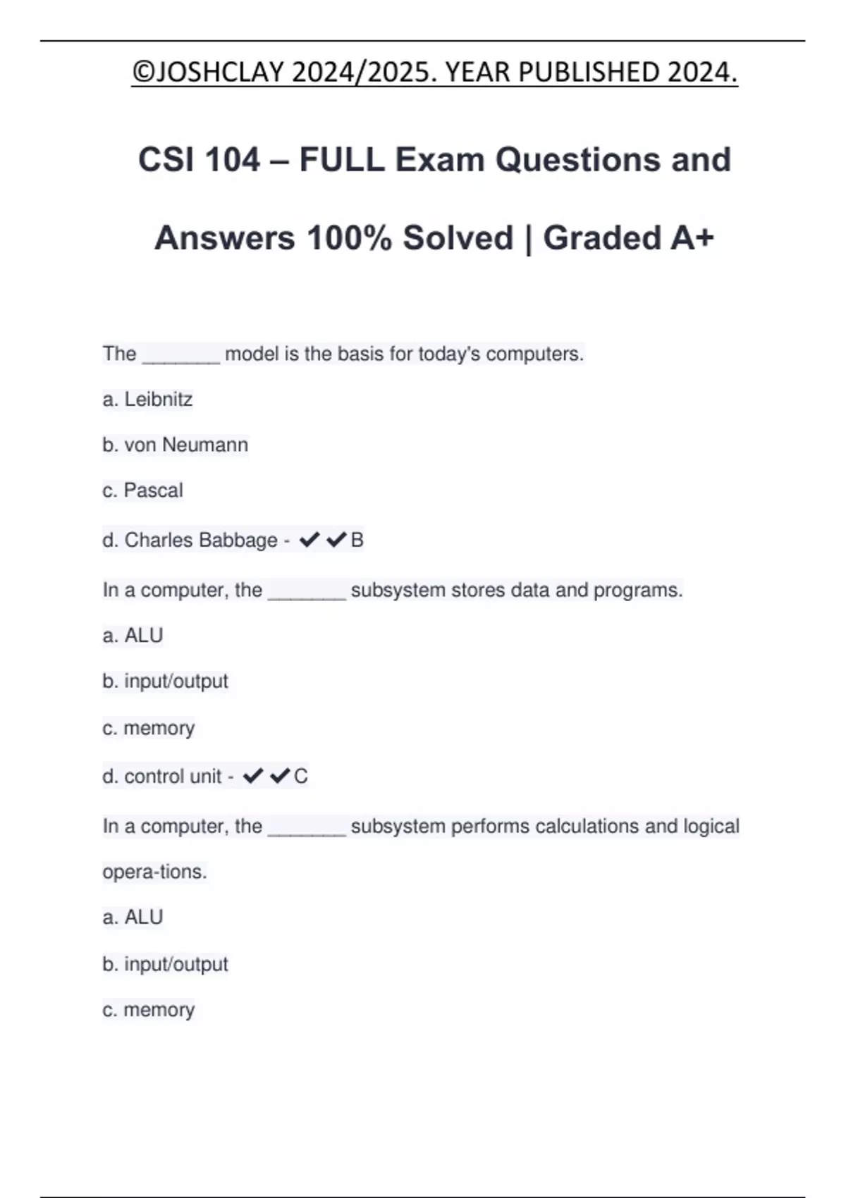 CSI 104 – FULL Exam Questions and Answers 100% Solved | Graded A+ The _______ model is the basis for today's computers. a. Leibnitz b. von Neumann c. Pascal d. Charles Babbage - B In a computer, the _______ subsystem stores data and programs. a. ALU b. input/output c. memory d. control unit - C In a computer, the _______ subsystem performs calculations and logical opera-tions. a. ALU b. input/output c. memory