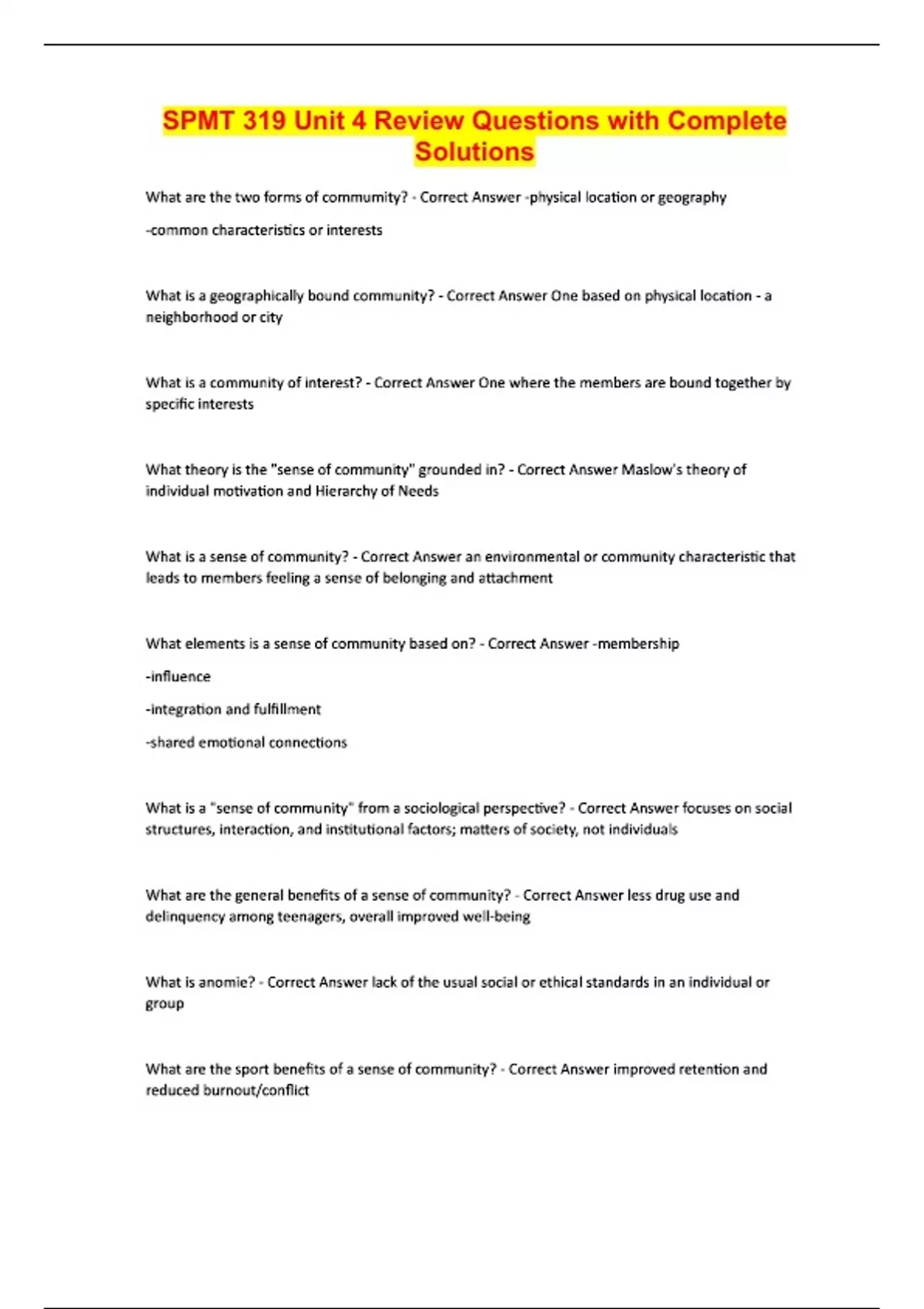 SPMT 319 Unit 4 Review Questions with Complete Solutions What are the two forms of commumity? - Correct Answer -physical location or geography -common characteristics or interests What is a geographically bound community? - Correct Answer One based on physical location - a neighborhood or city What is a community of interest? - Correct Answer One where the members are bound together by specific interests What theory is the "sense of community" grounded in? - Correct Answer Maslow's theory of individual motivation and Hierarchy of Needs What is a sense of community? - Correct Answer an environmental or community characteristic that leads to members feeling a sense of belonging and attachment What elements is a sense of community based on? - Correct Answer -membership -influence -integration and fulfillment -shared emotional connections What is a "sense of community" from a sociological perspective? - Correct Answer focuses on social structures, interaction, and institutional factors; matters of society, not individuals What are the general benefits of a sense of community? - Correct Answer less drug use and delinquency among teenagers, overall improved well-being What is anomie? - Correct Answer lack of the usual social or ethical standards in an individual or group What are the sport benefits of a sense of community? - Correct Answer improved retention and reduced burnout/conflict