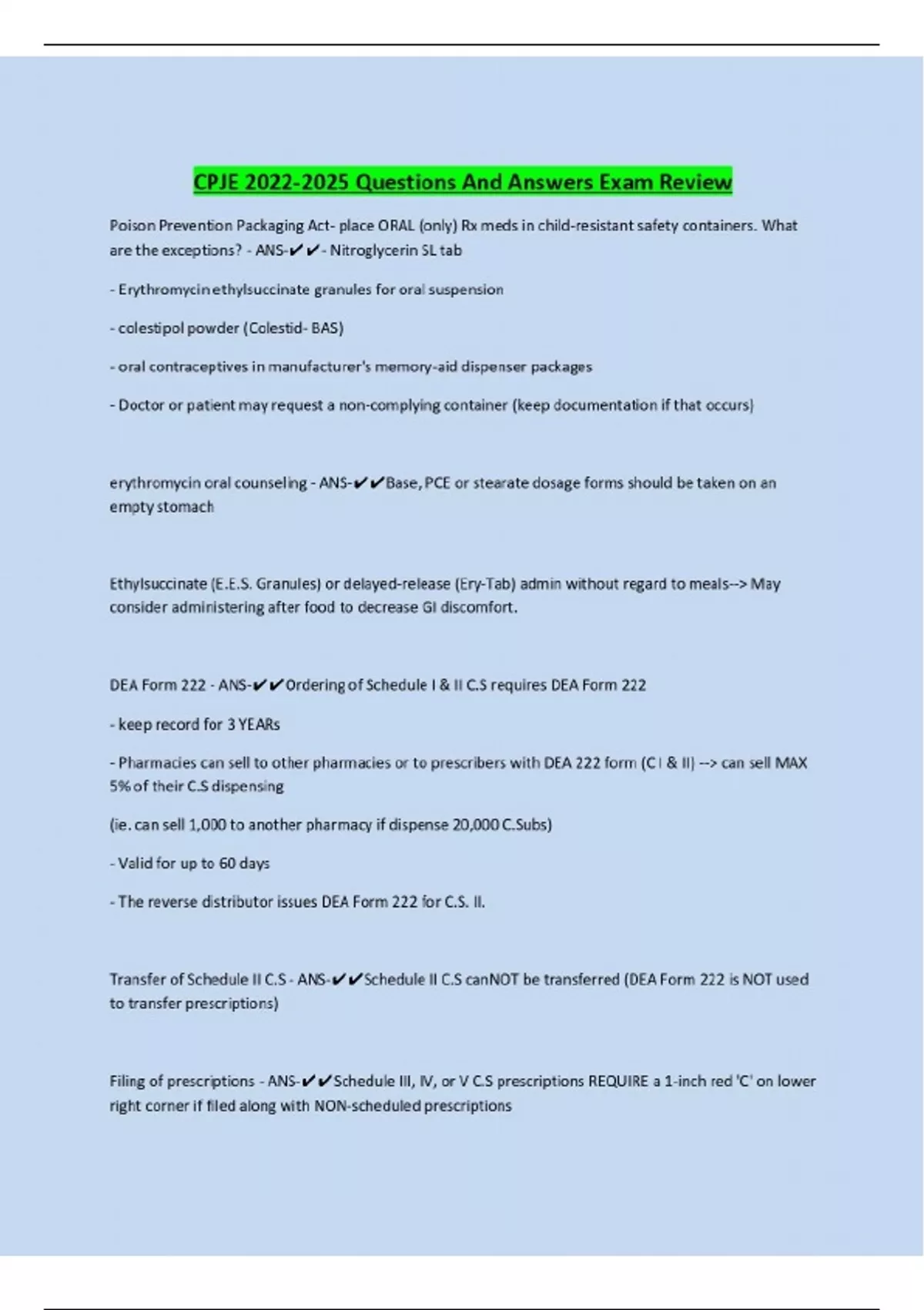 CPJE Questions And Answers Exam Review Poison Prevention Packaging Act- place ORAL (only) Rx meds in child-resistant safety containers. What are the exceptions? - ANS-- Nitroglycerin SL tab - Erythromycin ethylsuccinate granules for oral suspension - colestipol powder (Colestid- BAS) - oral contraceptives in manufacturer's memory-aid dispenser packages - Doctor or patient may request a non-complying container (keep documentation if that occurs) erythromycin oral counseling - ANS-Base, PCE or stearate dosage forms should be taken on an empty stomach Ethylsuccinate (E.E.S. Granules) or delayed-release (Ery-Tab) admin without regard to meals--> May consider administering after food to decrease GI discomfort. DEA Form 222 - ANS-Ordering of Schedule I & II C.S requires DEA Form 222 - keep record for 3 YEARs - Pharmacies can sell to other pharmacies or to prescribers with DEA 222 form (C I & II) --> can sell MAX 5% of their C.S dispensing (ie. can sell 1,000 to another pharmacy if dispense 20,000 C.Subs) - Valid for up to 60 days - The reverse distributor issues DEA Form 222 for C.S. II. Transfer of Schedule II C.S - ANS-Schedule II C.S canNOT be transferred (DEA Form 222 is NOT used to transfer prescriptions) Filing of prescriptions - ANS-Schedule III, IV, or V C.S prescriptions REQUIRE a 1-inch red 'C' on lower right corner if filed along with NON-scheduled prescriptions - does not apply for electronic filing systems - EXCEPTION: Schedule II C.S prescriptions MUST be filed separately Paper or electronic C.S prescription records must be kept for: - ANS-- Federal: 2 years - CA: 3 years - When there's a conflict between a federal and a state statute, the federal statute outweighs the state statute or regulation, unless the state law is more stringent and, thus, mandates over the less stringent federal rule. Refill PRN (non-scheduled drugs) - ANS-valid for 1 year from the date prescription was written CA Continuing Education Requirements - ANS-- 30 hours CE/2 years - 2 of the 30 CE hours MUST be law & ethics from a course provided by the Board - retain CE certificates for 4 years REMS (Risk Evaluation and Mitigation Strategies) - ANS-- required by the FDA for some drugs - developed by manufacturer and approved by FDA to ensure benefits outweigh risks, ensure appropriate prescribing and minimize patient risk Recalls, Market Withdrawals, & Safety Alerts - ANS- Continues...
