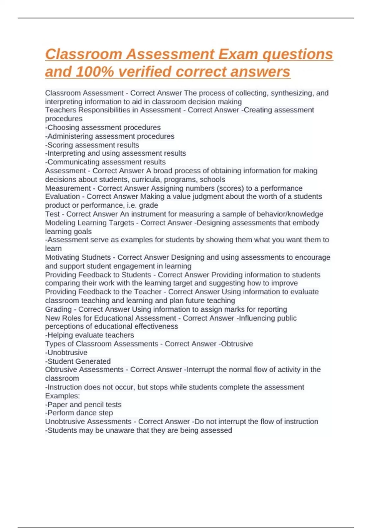 Classroom Assessment - Correct Answer The process of collecting, synthesizing, and