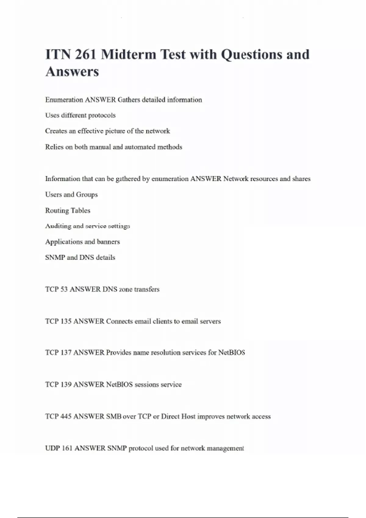 ITN 261 Midterm Test with Questions and Answers Enumeration ANSWER Gathers detailed information Uses different protocols Creates an effective picture of the network Relies on both manual and automated methods Information that can be gathered by enumeration ANSWER Network resources and shares Users and Groups Routing Tables Auditing and service settings Applications and banners SNMP and DNS details TCP 53 ANSWER DNS zone transfers TCP 135 ANSWER Connects email clients to email servers TCP 137 ANSWER Provides name resolution services for NetBIOS TCP 139 ANSWER NetBIOS sessions service TCP 445 ANSWER SMB over TCP or Direct Host improves network access UDP 161 ANSWER SNMP protocol used for network management TCP/UDP 389 ANSWER LDAP used by many directory applications