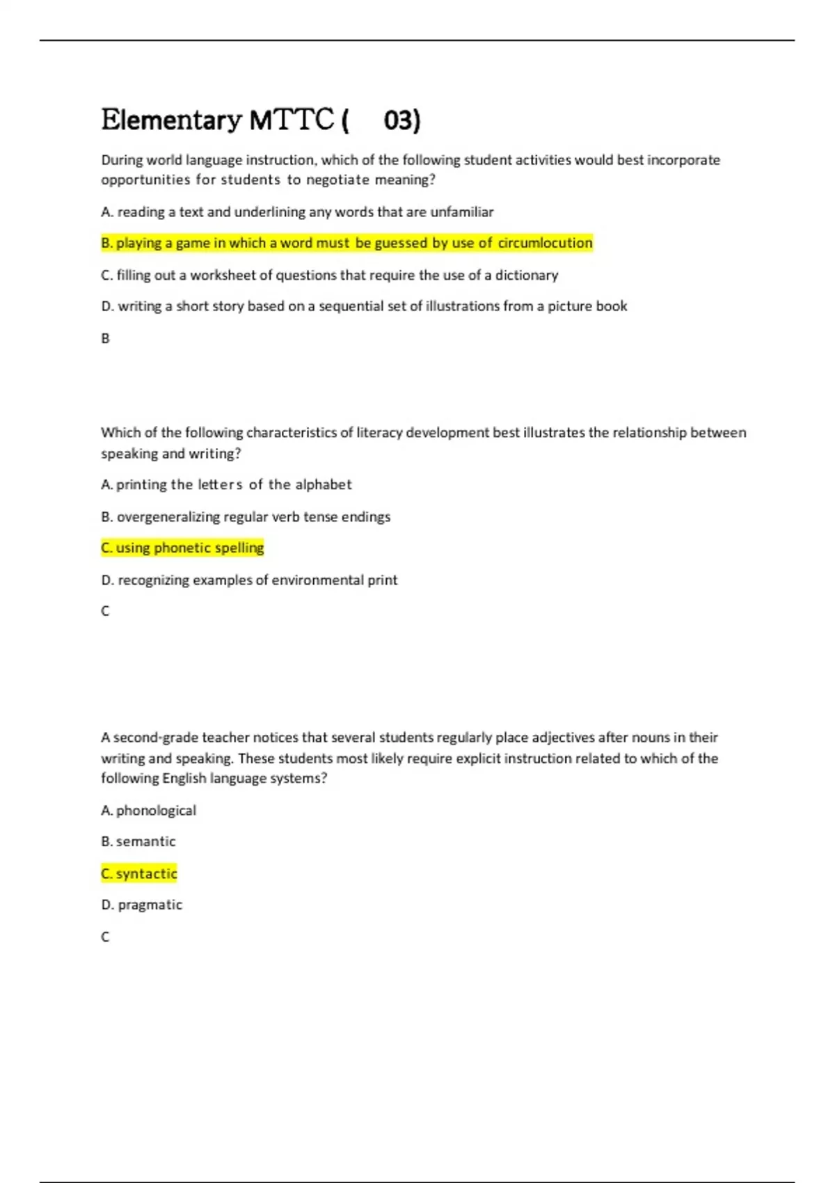 During world language instruction, which of the following student activities would best incorporate opportunities for students to negotiate meaning? A. reading a text and underlining any words that are unfamiliar B. playing a game in which a word must be guessed by use of circumlocution C. filling out a worksheet of questions that require the use of a dictionary D. writing a short story based on a sequential set of illustrations from a picture book B Which of the following characteristics of literacy development best illustrates the relationship between speaking and writing? A. printing the letters of the alphabet B. overgeneralizing regular verb tense endings C. using phonetic spelling D. recognizing examples of environmental print C
