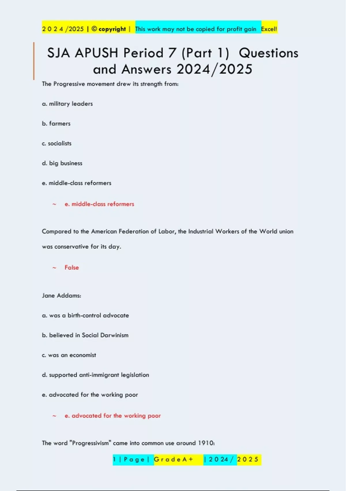 The Progressive movement drew its strength from: a. military leaders b. farmers c. socialists d. big business e. middle-class reformers  e. middle-class reformers Compared to the American Federation of Labor, the Industrial Workers of the World union was conservative for its day.  False Jane Addams: a. was a birth-control advocate b. believed in Social Darwinism c. was an economist d. supported anti-immigrant legislation e. advocated for the working poor  e. advocated for the working poor The word "Progressivism" came into common use around 1910: 2 0 2 4 /2025 | © copyright | This work may not be copied for profit gain Excel! 1 | P a g e | G r a d e A + | 2 0 24 / 2 0 2 5 a. as a way of describing a loosely defined political movement b. as another term for socialism c. denoting a group that appealed only to women d. and represented those who advocated revolution e. as an antibusiness term  a. as a way of describing a loosely defined political movement During the Progressive era, the working woman became a symbol of female emancipation.  True All of the following statements about urban Progressives are true EXCEPT that: a. they sought to improve public transportation b. they sought to establish public control of gas and water works c. they worked with political machines d. they raised taxes to increase spending on schools and parks e. they worked to reform the structure of government  c. they worked with political machines During the Progressive era: a. social reformers concentrated their efforts on rural areas b. urban development highlighted social inequalities c. cities competed with rural areas for government projects 2 0 2 4 /2025 | © copyright | This work may not be copied for profit gain Excel! 1 | P a g e | G r a d e A + | 2 0 24 / 2 0 2 5 d. cities declined in importance e. cities attracted only the wealthy  b. urban development highlighted social inequalities During the Progressive era: a. most African-American women worked in factories b. the number of married women working declined c. growing numbers of native-born white women worked as domestics d. growing numbers of native-born white women worked in offices e. most eastern European im