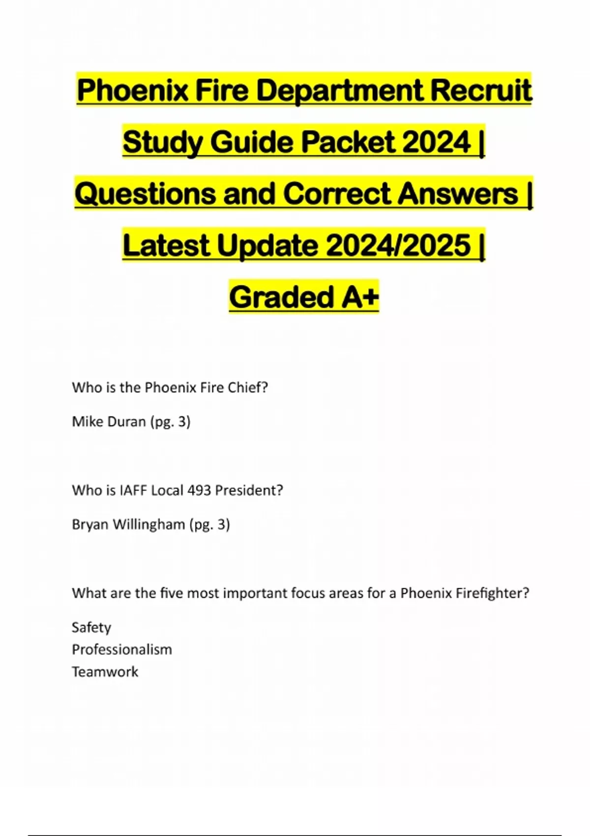 Phoenix Fire Department Recruit Study Guide Packet 2024 | Questions and Correct Answers | Latest Update 2024/2025 | Graded A+ Who is the Phoenix Fire Chief? Mike Duran (pg. 3) Who is IAFF Local 493 President? Bryan Willingham (pg. 3) What are the five most important focus areas for a Phoenix Firefighter? Safety Professionalism TeamworkRespect Personal Development (pg. 3) Phoenix Fire Department mission statement? The Phoenix Fire Department is committed to providing the highest level of customer service and resources to our community and members. We save lives and protect property through fire suppression, emergency medical and transportation se