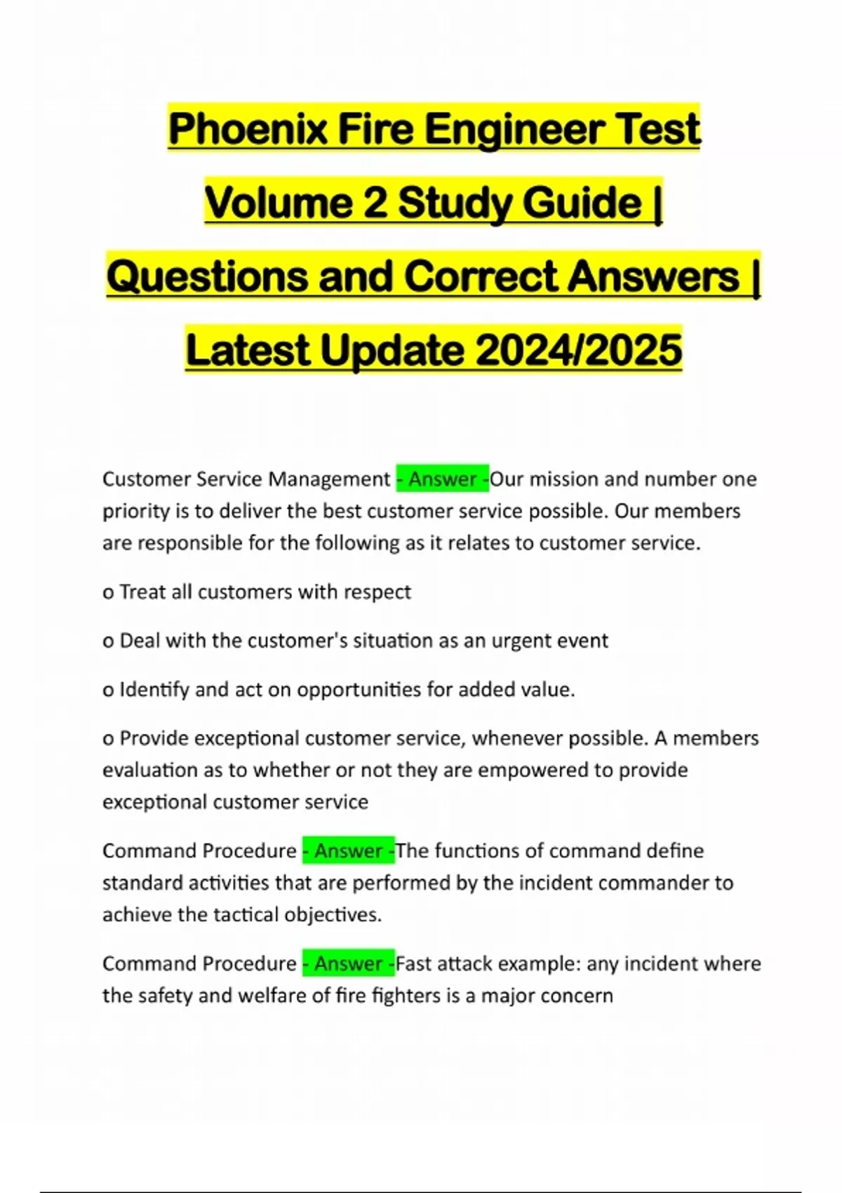 Phoenix Fire Engineer Test Volume 2 Study Guide | Questions and Correct Answers | Latest Update 2024/2025 Customer Service Management - Answer -Our mission and number one priority is to deliver the best customer service possible. Our members are responsible for the following as it relates to customer service. o Treat all customers with respect o Deal with the customer's situation as an urgent event o Identify and act on opportunities for added value. o Provide exceptional customer service, whenever possible. A members evaluation as to whether or not they are empowered to provide exceptional customer service Command Procedure - Answer -The functions of command define standard activities that are performed by the incident commander to achieve the tactical objectives. Command Procedure - Answer -Fast attack example: any incident where the safety and welfare of fire fighters is a major concernCommand Procedure - Answer -Within the chain of command, the actual transfer of command will be regulated by the following procedure: 1. The officer assuming command (IC#2) will communicate with the person being relieved (IC#1) by radio or face-to-face. Face-toFace- is the preferred method to transfer command.