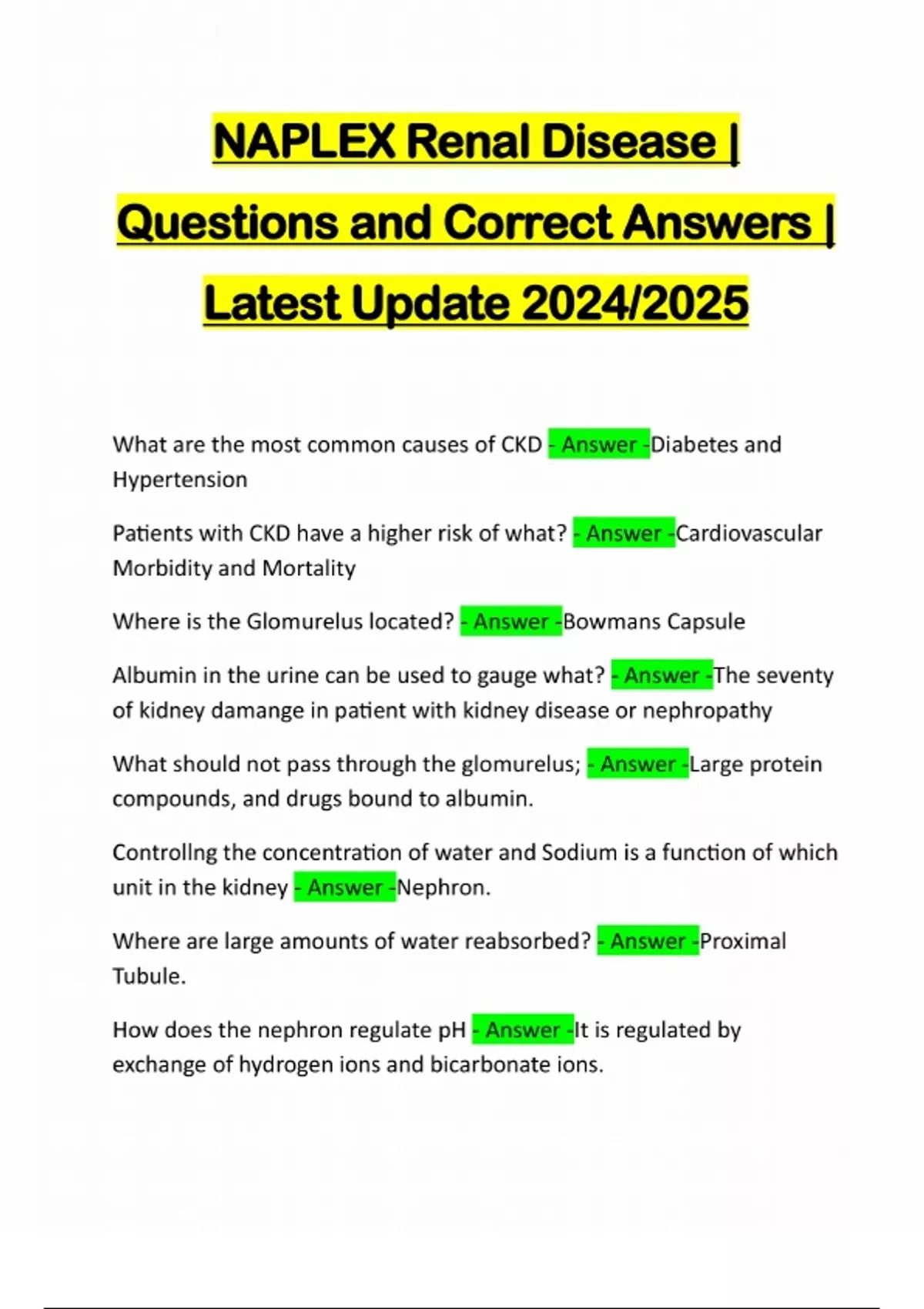 NAPLEX Renal Disease | Questions and Correct Answers | Latest Update 2024/2025 What are the most common causes of CKD - Answer -Diabetes and Hypertension Patients with CKD have a higher risk of what? - Answer -Cardiovascular Morbidity and Mortality Where is the Glomurelus located? - Answer -Bowmans Capsule Albumin in the urine can be used to gauge what? - Answer -The seventy of kidney damange in patient with kidney disease or nephropathy What should not pass through the glomurelus; - Answer -Large protein compounds, and drugs bound to albumin. Controllng the concentration of water and Sodium is a function of which unit in the kidney - Answer -Nephron. Where are large amounts of water reabsorbed? - Answer -Proximal Tubule. How does the nephron regulate pH - Answer -It is regulated