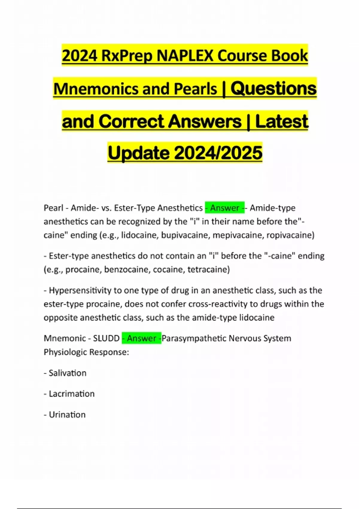 2024 RxPrep NAPLEX Course Book Mnemonics and Pearls | Questions and Correct Answers | Latest Update 2024/2025 Pearl - Amide- vs. Ester-Type Anesthetics - Answer -- Amide-type anesthetics can be recognized by the "i" in their name before the"- caine" ending (e.g., lidocaine, bupivacaine, mepivacaine, ropivacaine) - Ester-type anesthetics do not contain an "i" before the "-caine" ending (e.g., procaine, benzocaine, cocaine, tetracaine) - Hypersensitivity to one type of drug in an anesthetic class, such as the ester-type procaine, does not confer cross-reactivity to drugs within the opposite anesthetic class, such as the amide-type lidocaine Mnemonic - SLUDD - Answer -Parasympathetic Nervous System Physiologic Response: - Salivation - Lacrimation - Urination- Defecation - Digestion Mnemonic - G-PACMAN - Answer -