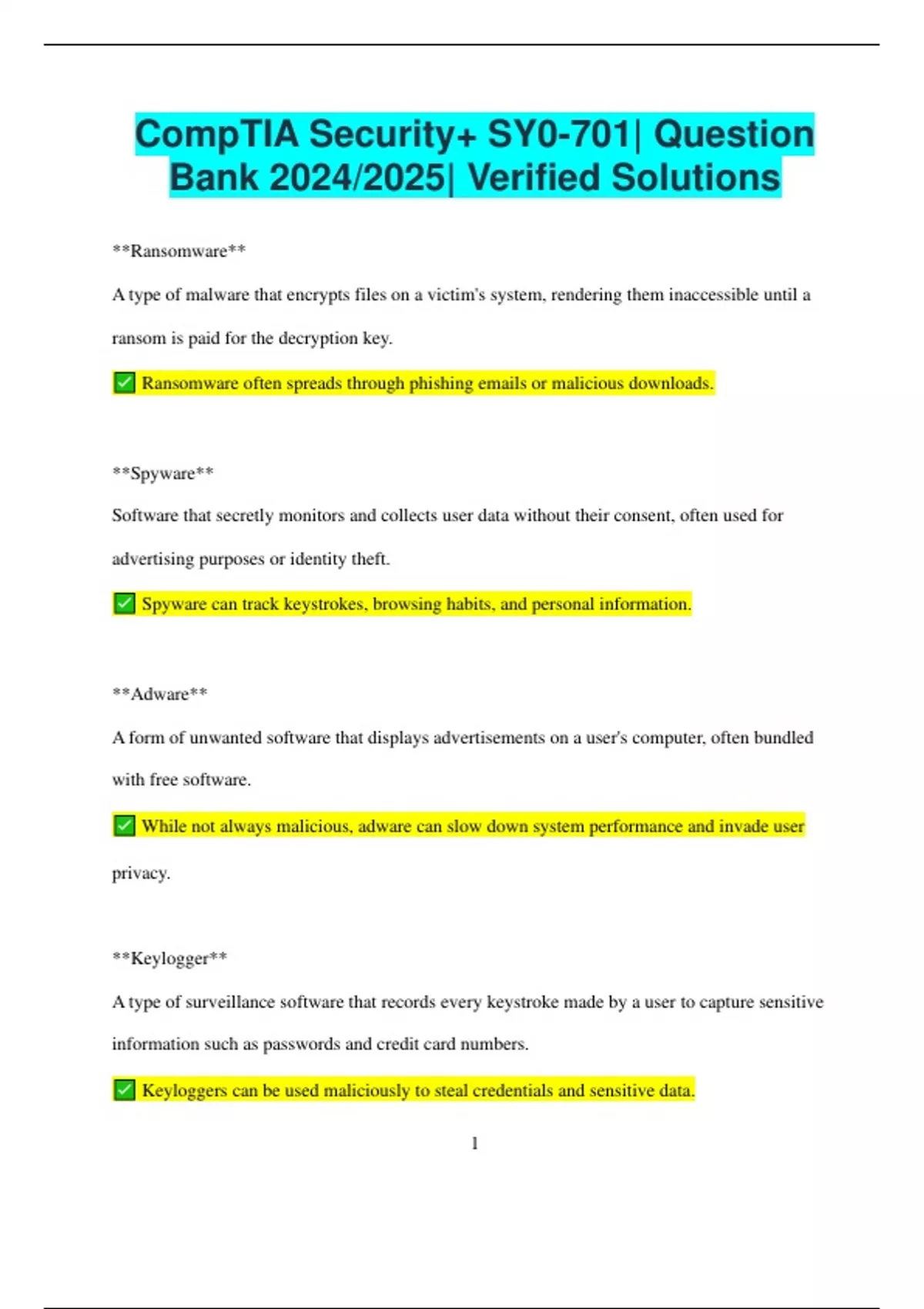 CompTIA Security+ SY0-701| Question Bank 2024/2025| Verified Solutions **Ransomware** A type of malware that encrypts files on a victim's system, rendering them inaccessible until a ransom is paid for the decryption key. Ransomware often spreads through phishing emails or malicious downloads. **Spyware** Software that secretly monitors and collects user data without their consent, often used for advertising purposes or identity theft. Spyware can track keystrokes, browsing habits, and personal information. **Adware** A form of unwanted software that displays advertisements on a user's computer, often bundled with free software. While not always malicious, adware can slow down system performance and invade user privacy. **Keylogger** A type of surveillance software that records every keystroke made by a user to capture sensitive information such as passwords and credit card numbers. Keyloggers can be used maliciously to steal credentials and sensitive data. 2 **Rootkit** A collection of software tools that allow unauthorized users to gain control of a computer system while remaining undetected. Rootkits can modify system files and processes to hide their presence. **Botnet** A network of compromised computers controlled by a single attacker to perform automated tasks, often used for distributed denial-of-service (DDoS) attacks. Botnets can be used to execute large-scale attacks or send spam emails. **Logic Bomb** A piece of code intentionally inserted into software that triggers a malicious action when specific conditions are met. Logic bombs can be difficult to detect until activated. **Backdoor** A method of bypassing normal authentication to gain unauthorized access to a system, often left by malware or a compromised application. Backdoors can be used by attackers to regain access after the initial intrusion has been removed. **Phishing** 3 A social engineering technique used to deceive individuals into providing sensitive information, often via fraudulent emails or websites. Phishing attacks can lead to identity theft and financial loss. **Denial of Service (DoS) Attack** An attack designed to overwhelm a service or network resource, rendering it unavailable to legitimate users. DoS attacks can disrupt operations and lead to financial losses for organizations. **Social Engineering** A manipulation technique that exploits human psychology to gain confidential information or access to secure systems. Social engineering tactics often include phishing, pretexting, and baiting. **Malware** A general term for any software intentionally designed to cause damage to a computer, se