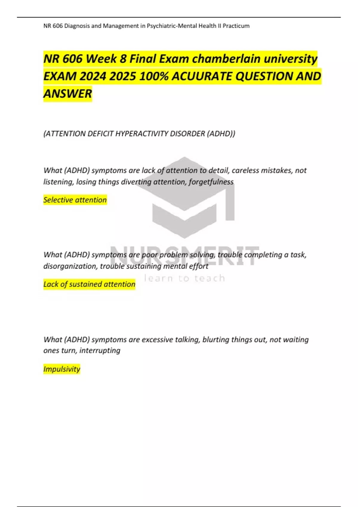 NR 606 Week 8 Final Exam chamberlain university EXAM % ACCURATE QUESTION AND ANSWER