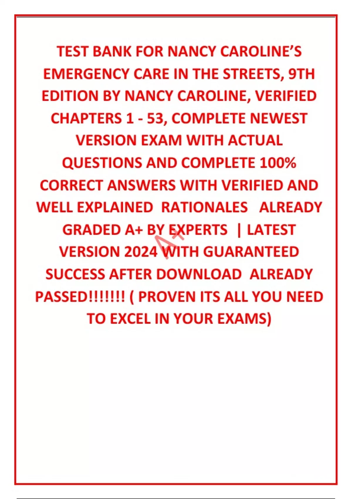 TEST BANK FOR NANCY CAROLINE’S EMERGENCY CARE IN THE STREETS, 9TH EDITION BY NANCY CAROLINE, VERIFIED CHAPTERS 1 - 53, COMPLETE NEWEST VERSION EXAM WITH ACTUAL QUESTIONS AND COMPLETE 100% CORRECT ANSWERS WITH VERIFIED AND WELL EXPLAINED RATIONALES ALR