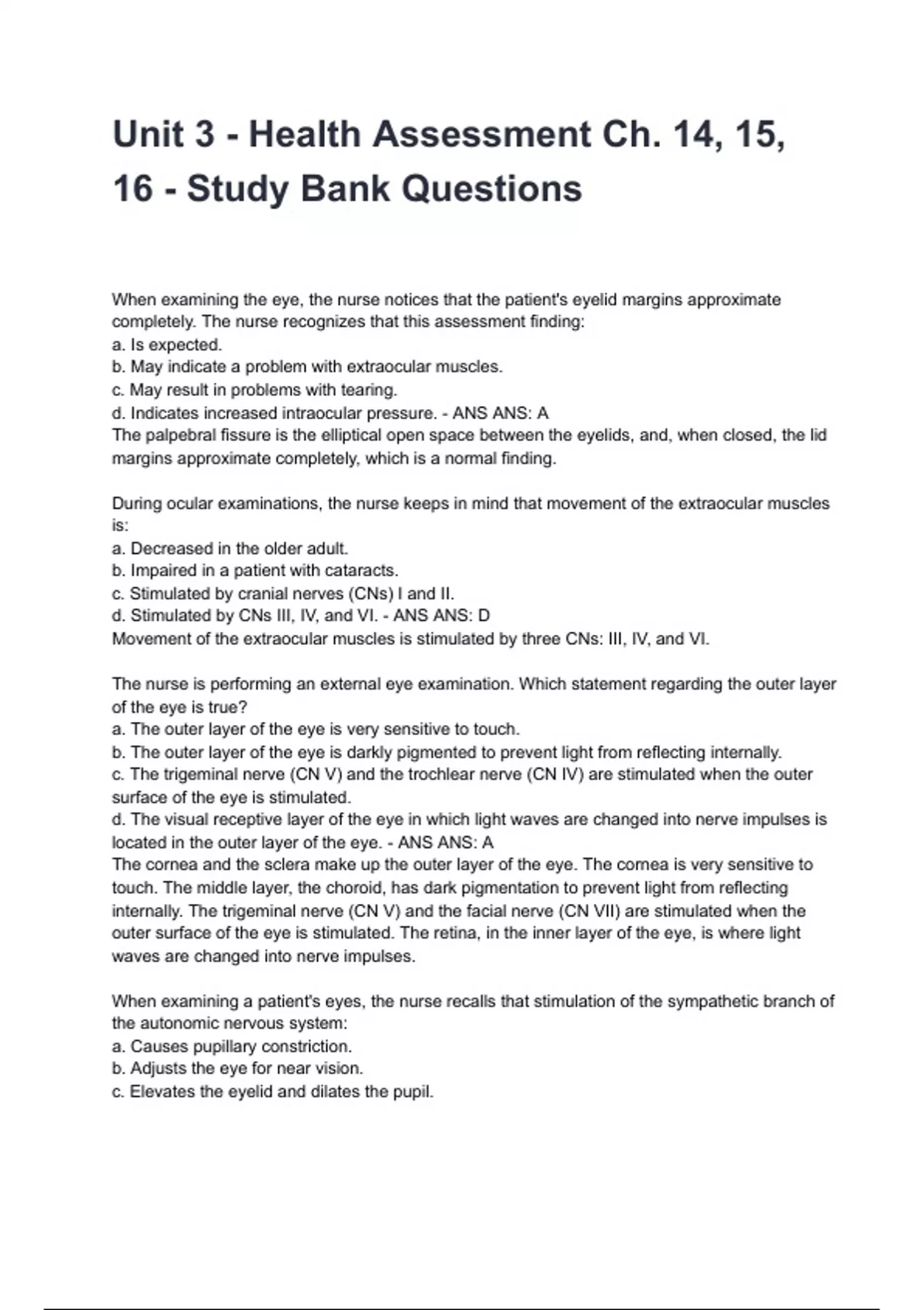 Unit 3 - Health Assessment Ch. 14, 15, 16 - Study Test Bank 2024/2025 Questions With Completed & Verified Solutions.