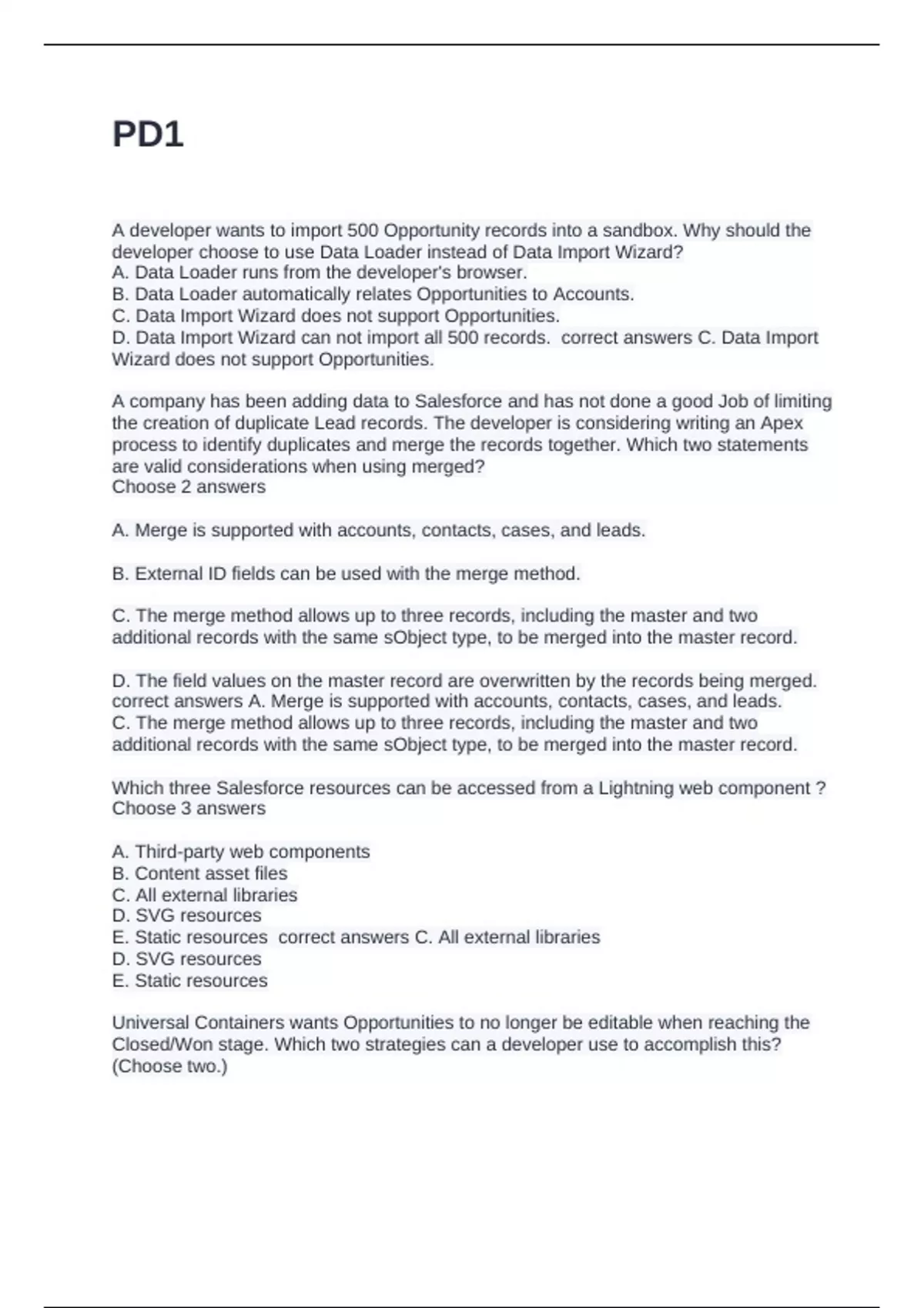 correct answers A. Merge is supported with accounts, contacts, cases, and leads.