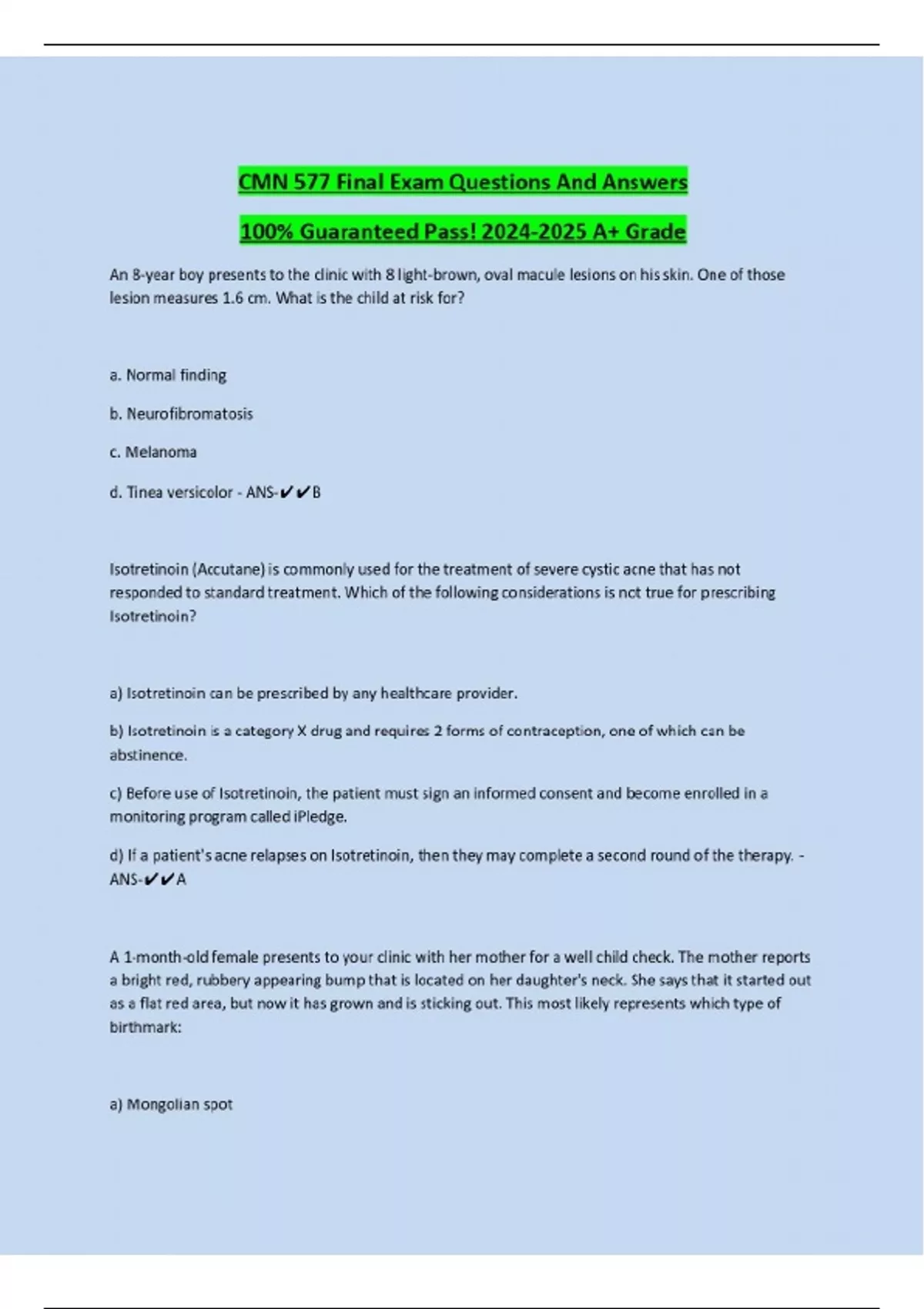CMN 577 Final Exam Questions And Answers 100% Guaranteed Pass! A+ Grade An 8-year boy presents to the clinic with 8 light-brown, oval macule lesions on his skin. One of those lesion measures 1.6 cm. What is the child at risk for? a. Normal finding b. Neurofibromatosis c. Melanoma d. Tinea versicolor - ANS-B Isotretinoin (Accutane) is commonly used for the treatment of severe cystic acne that has not responded to standard treatment. Which of the following considerations is not true for prescribing Isotretinoin? a) Isotretinoin can be prescribed by any healthcare provider. b) Isotretinoin is a category X drug and requires 2 forms of contraception, one of which can be abstinence. c) Before use of Isotretinoin, the patient must sign an informed consent and become enrolled in a monitoring program called iPledge. d) If a patient's acne relapses on Isotretinoin, then they may complete a second round of the therapy. - ANS-A A 1-month-old female presents to your clinic with her mother for a well child check. The mother reports a bright red, rubbery appearing bump that is located on her daughter's neck. She says that it started out as a flat red area, but now it has grown and is sticking out. This most likely represents which type of birthmark: a) Mongolian spot b) Port-wine stain c) Hemangioma d) Melanocytic nevi - ANS-C You are seeing a 6-year-old male who was brought in by his mother. The mother reports they recently took a family vacation last week and stayed in a few different hotels. He developed significant itching and a rash the day of returning home. He is noted to continuously scratch during the visit. The father and older sister also have a similar rash that developed at the same time. On exam, you note linear burrows around his wrists, ankles, in the webbing of his fingers, and axillary folds with excoriations present. There is no facial involvement. He has never had anything like this before. The most likely diagnosis would be: A. Atopic Dermatitis B. Impetigo C. Molluscum Contagiosum D. Scabies - ANS-D A 16-year-old female presents to clinic accompanied by her mother. She has a rash that appears as erythematous plaques with thick, white, silvery overlying scales on her elbows, knees, and umbilicus. She reports this has been going on for about 2 years and tends to come and go. The mother reports her father has psoriasis. The patient is not on any medications and she is not currently treating her rash with anything. She has tried various moisturizers in the past but has never had a prescription to treat this. She weighs 130 pounds and has no allergies. You diagnose her with psoriasis with body surface area involvement less than 10%. Which is the best option as first line therapy? ... Continues....