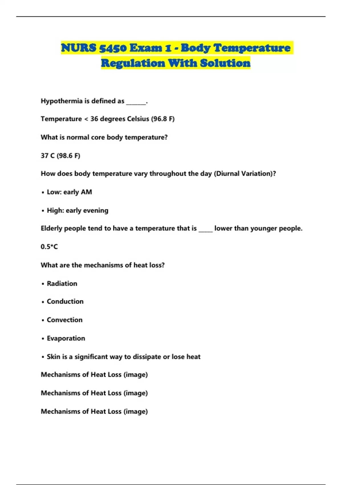 NURS 5450 Exam 1 - Body Temperature Regulation With Solution