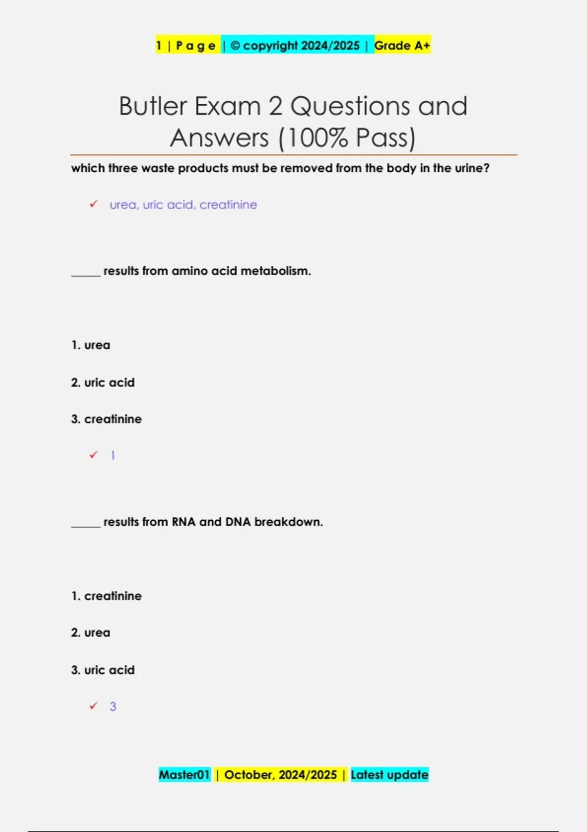 which three waste products must be removed from the body in the urine? urea, uric acid, creatinine _____ results from amino acid metabolism. 1. urea 2. uric acid 3. creatinine 1 _____ results from RNA and DNA breakdown. 1. creatinine 2. urea 3. uric acid 3 Master01 | October, 2024/2025 | Latest update 1 | P a g e | © copyright 2024/2025 | Grade A+ ____ is a waste product of muscle metabolism. 1. uric acid 2. creatinine 3. urea 2 normal urine color should be... straw colored without sediment urine color is an indicator of... hydration level cloudy urine indicates increased ______. turbidity (sediment or substance) sediment in the urine can include... fat globules, red or WBCs, bacteria, or sitting at room temp for a long time Master01 | October, 2024/2025 | Latest update 1 | P a g e | © copyright 2024/2025 | Grade A+ a urine sample that sat at room temp for a long time can increase what? turbidity (cloudiness) hematuria is when ____ is present in the urine blood a high pH is alkaline and can cause ______ in a urine sample turbidity or crystals sediment is... any substance that settles to the bottom of a liquid normal urine should have what kind of smell? very mild, slightly aromatic how much urine output should be expected in one day? 1,000 - 3,000 m