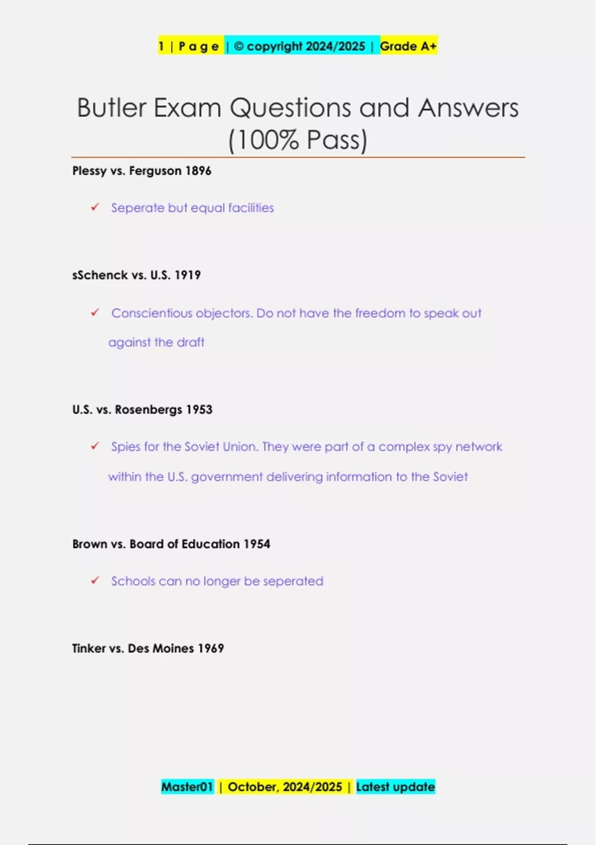 Plessy vs. Ferguson 1896 Seperate but equal facilities sSchenck vs. U.S. 1919 Conscientious objectors. Do not have the freedom to speak out against the draft U.S. vs. Rosenbergs 1953 Spies for the Soviet Union. They were part of a complex spy network within the U.S. government delivering information to the Soviet Brown vs. Board of Education 1954 Schools can no longer be seperated Tinker vs. Des Moines 1969 Master01 | October, 2024/2025 | Latest update 1 | P a g e | © copyright 2024/2025 | Grade A+ Protested the Vietnam war at school. Sent home and suspended. In court they decided that freedom of speech applies everywhere and tha tsince their armband protest did not interupt education that they could wear them Texas vs. Johnson 1989 Johnson burns flag but for unity of country and was let of in supreme court on freedom of speech First Amendment Freedom of speech, religion, press, right to assembly and to petition Second Amendment Right to bear a