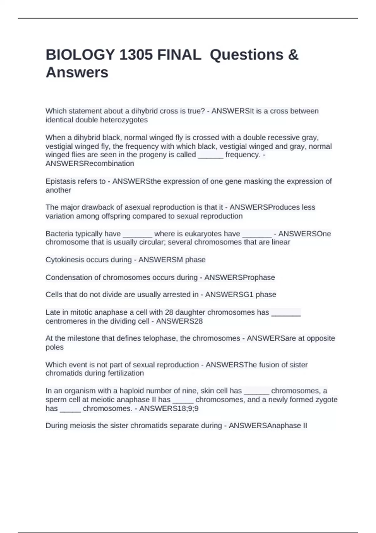 BIOLOGY 1305 FINAL Questions & Answers