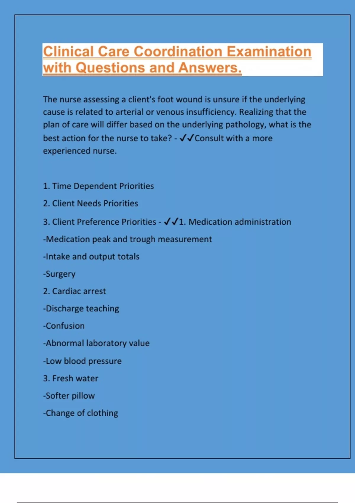 The nurse assessing a client's foot wound is unsure if the underlying cause is related to arterial or venous insufficiency. Realizing that the plan of care will differ based on the underlying pathology, what is the best action for the nurse to take? - Consult with a more experienced nurse. 1. Time Dependent Priorities 2. Client Needs Priorities 3. Client Preference Priorities - 1. Medication administration -Medication peak and trough measurement -Intake and output totals -Surgery 2. Cardiac arrest -Discharge teaching -Confusion -Abnormal laboratory value -Low blood pressure 3. Fresh water -Softer pillow -Change of clothing