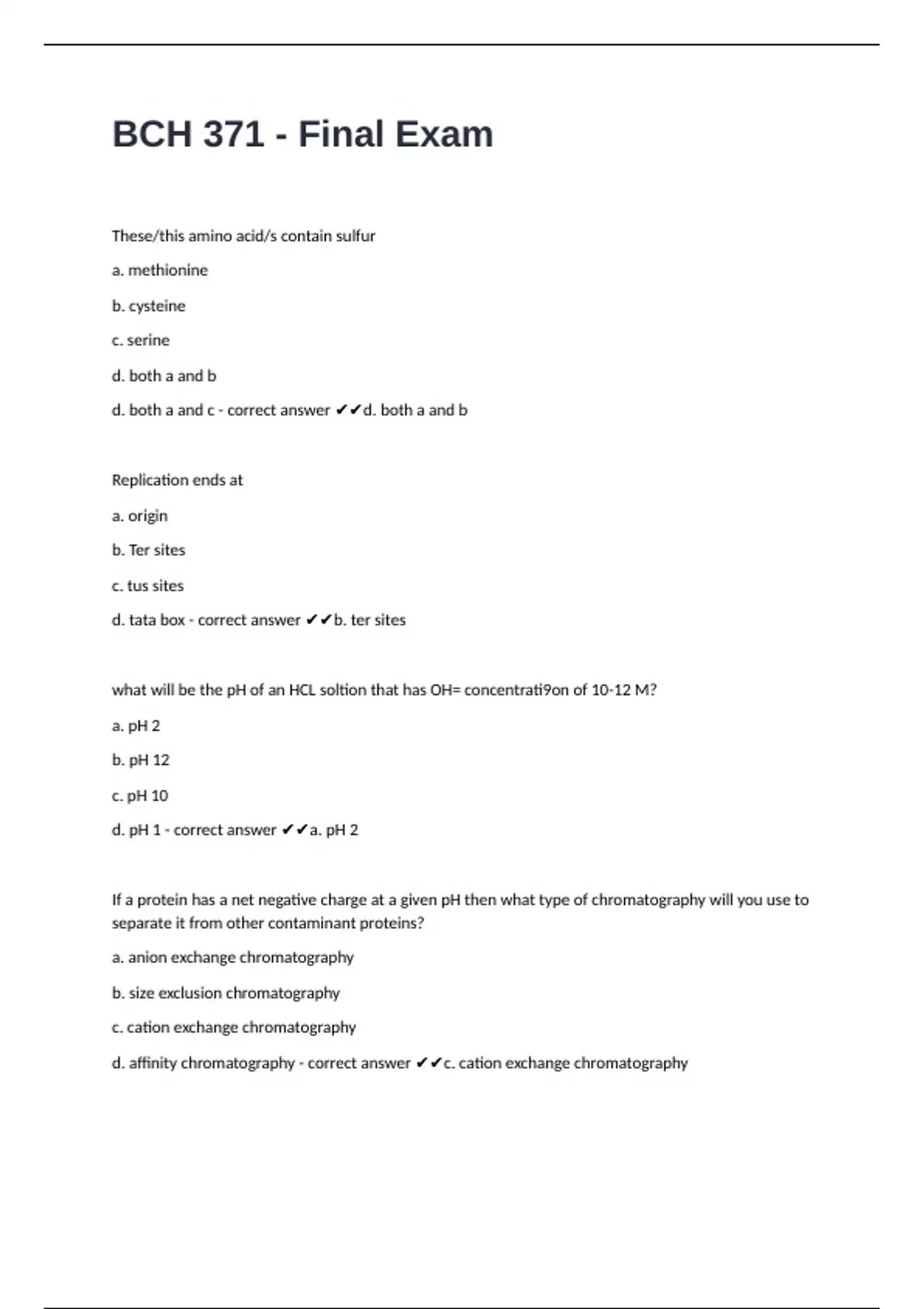 BCH 371 - Final Exam questions well answered