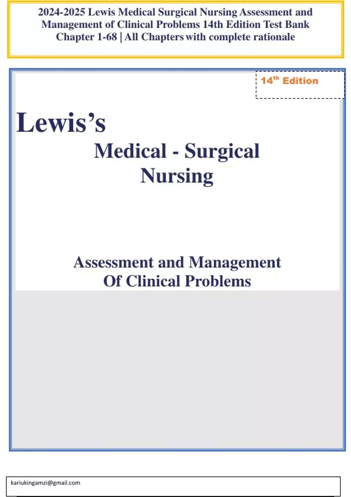 Lewis's Medical-Surgical Nursing 14th Edition by Mariann M. Harding PhD RN CNE FAADN (Author), & 4 more Lewis Medical Surgical Nursing Assessment and Management of Clinical Problems 14th Edition Test Bank Chapter 1-68 | All Chapters with complete rationale 1.Which information will the nurse consider when deciding what nursing actions to delegate to a licensed practical/vocational nurse (LPN/LVN) who is working on a medical-surgical unit (select all that apply)? a. Institutional policies b. Stability of the patient c. State nurse practice act d. LPN/LVN teaching abilities e. Experience of the LPN/LVN