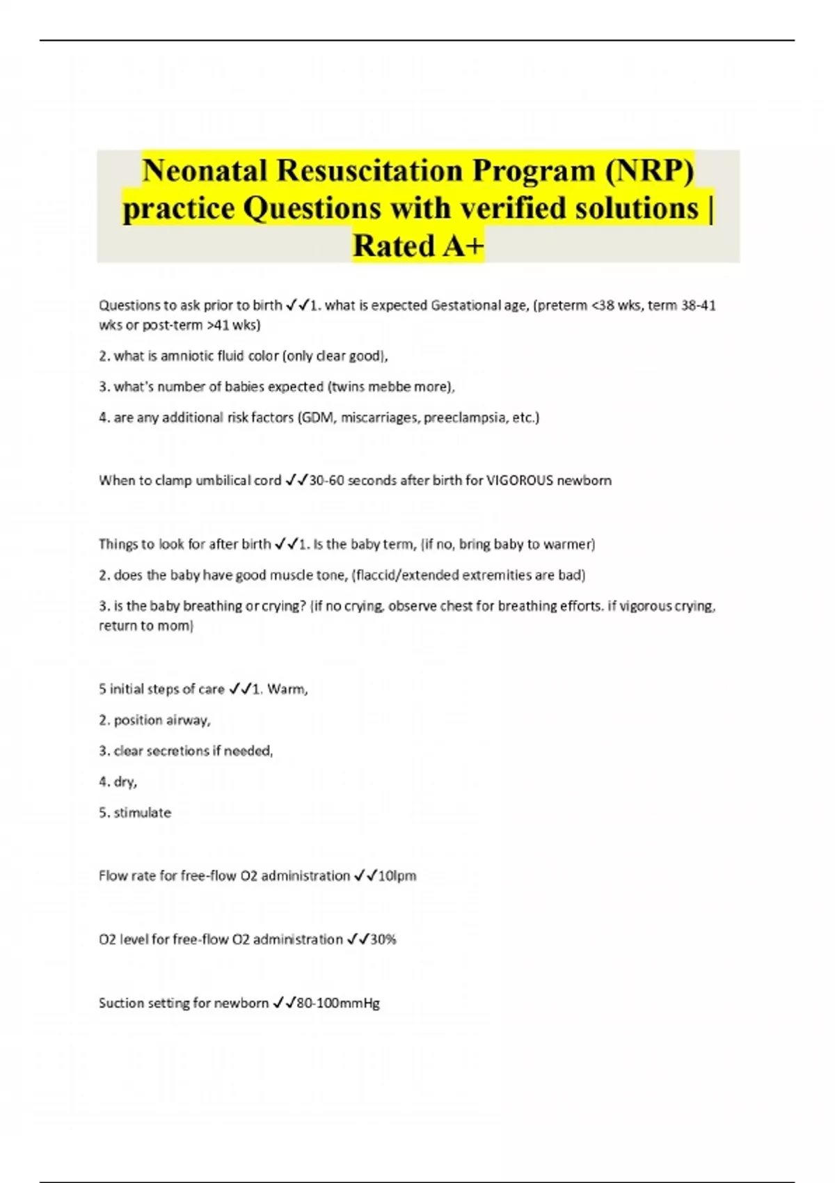 Neonatal Resuscitation Program (NRP) practice Questions with verified solutions | Rated A+