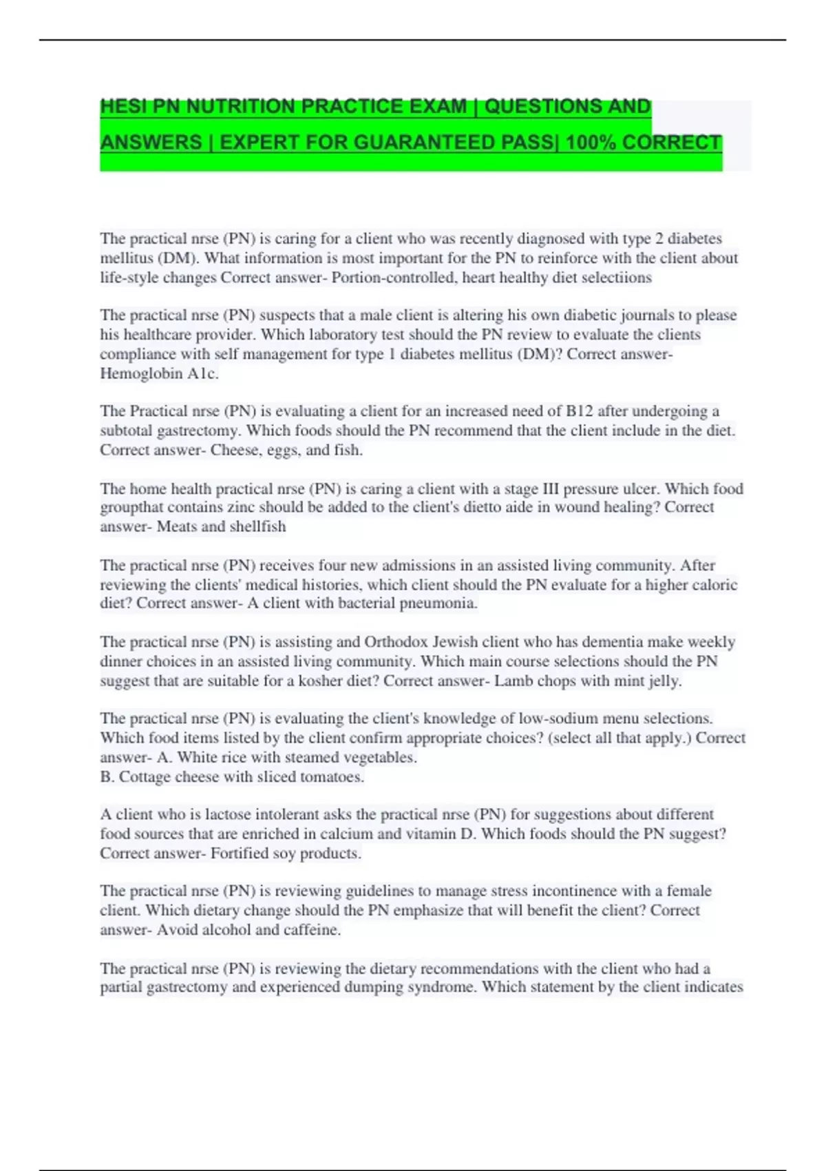 HESI PN NUTRITION PRACTICE EXAM | QUESTIONS AND ANSWERS | EXPERT FOR GUARANTEED PASS| 100% CORRECT The practical nrse (PN) is caring for a client who was recently diagnosed with type 2 diabetes mellitus (DM). What information is most important for the PN to reinforce with the client about life-style changes Correct answer- Portion-controlled, heart healthy diet selectiions The practical nrse (PN) suspects that a male client is altering his own diabetic journals to please his healthcare provider. Which laboratory test should the PN review to evaluate the clients compliance with self management for type 1 diabetes mellitus (DM)? Correct answer- Hemoglobin A1c. The Practical nrse (PN) is evaluating a client for an increased need of B12 after undergoing a subtotal gastrectomy. Which foods should the PN recommend that the client include in the diet. Correct answer- Cheese, eggs, and fish. The home health practical nrse (PN) is caring a client with a stage III pressure ulcer. Which food groupthat contains zinc should be added to the client's dietto aide in wound healing? Correct answer- Meats and shellfish The practical nrse (PN) receives four new admissions in an assisted living community. After reviewing the clients' medical histories, which client should the PN evaluate for a higher caloric diet? Correct answer- A client with bacterial pneumonia. The practical nrse (PN) is assisting and Orthodox Jewish client who has dementia make weekly dinner choices in an assisted living community. Which main course selections should the PN suggest that are suitable for a kosher diet? Correct answer- Lamb chops with mint jelly. The practical nrse (PN) is evaluating the client's knowledge of low-sodium menu selections. Which food items listed by the client confirm appropriate choices? (select all that apply.) Correct answer- A. White rice with steamed vegetables. B. Cottage cheese with sliced tomatoes. A client who is lactose intolerant asks the practical nrse (PN) for suggestions about different food sources that are enriched in calcium and vitamin D. Which foods should the PN suggest? Correct answer- Fortified soy products. The practical nrse (PN) is reviewing guidelines to manage stress incontinence with a female client. Which dietary change should the PN emphasize that will benefit the client? Correct answer- Avoid alcohol and caffeine. The practical nrse (PN) is reviewing the dietary recommendations with the client who had a partial gastrectomy and experienced dumping syndrome. Which statement by the client indicates