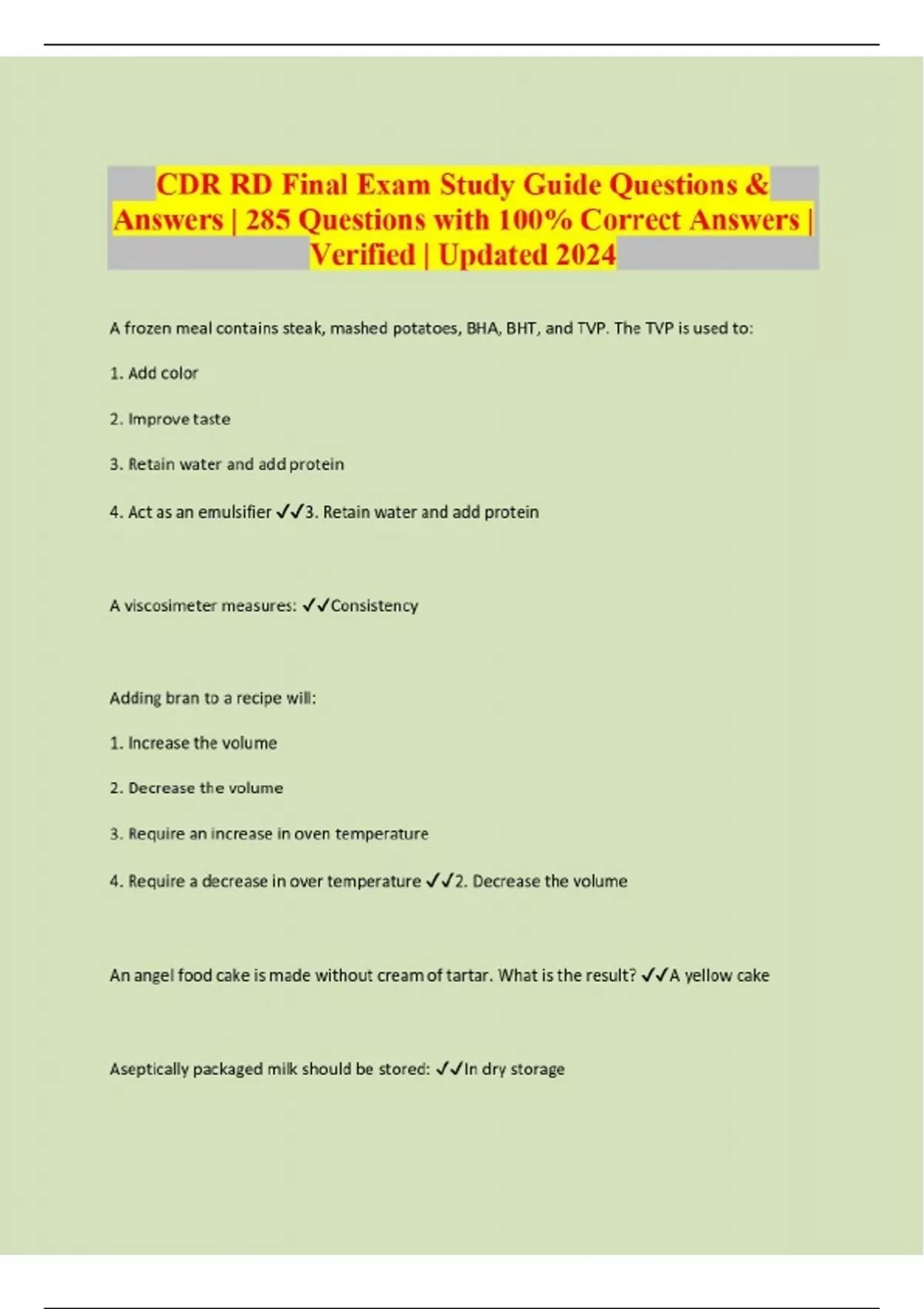 CDR RD Final Exam Study Guide Questions & Answers | 285 Questions with 100% Correct Answers | Verified | Updated 2024