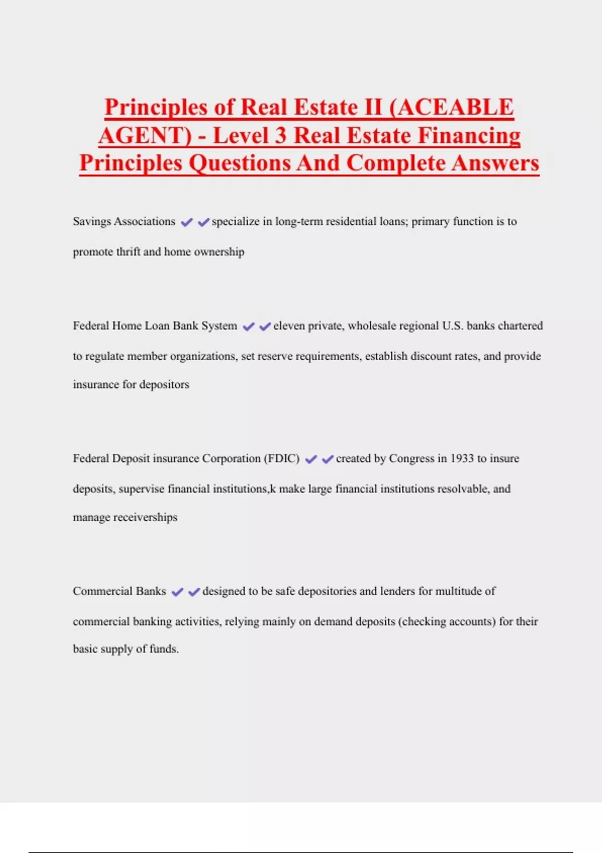 Principles of Real Estate II (ACEABLE AGENT) - Level 3 Real Estate Financing Principles Questions And Complete Answers Savings Associations specialize in long-term residential loans; primary function is to promote thrift and home ownership Federal Home Loan Bank System eleven private, wholesale regional U.S. banks chartered to regulate member organizations, set reserve requirements, establish discount rates, and provide insurance for depositors Federal Deposit insurance Corporation (FDIC) created by Congress in 1933 to insure deposits, supervise financial institutions,k make large financial institutions resolvable, and manage receiverships