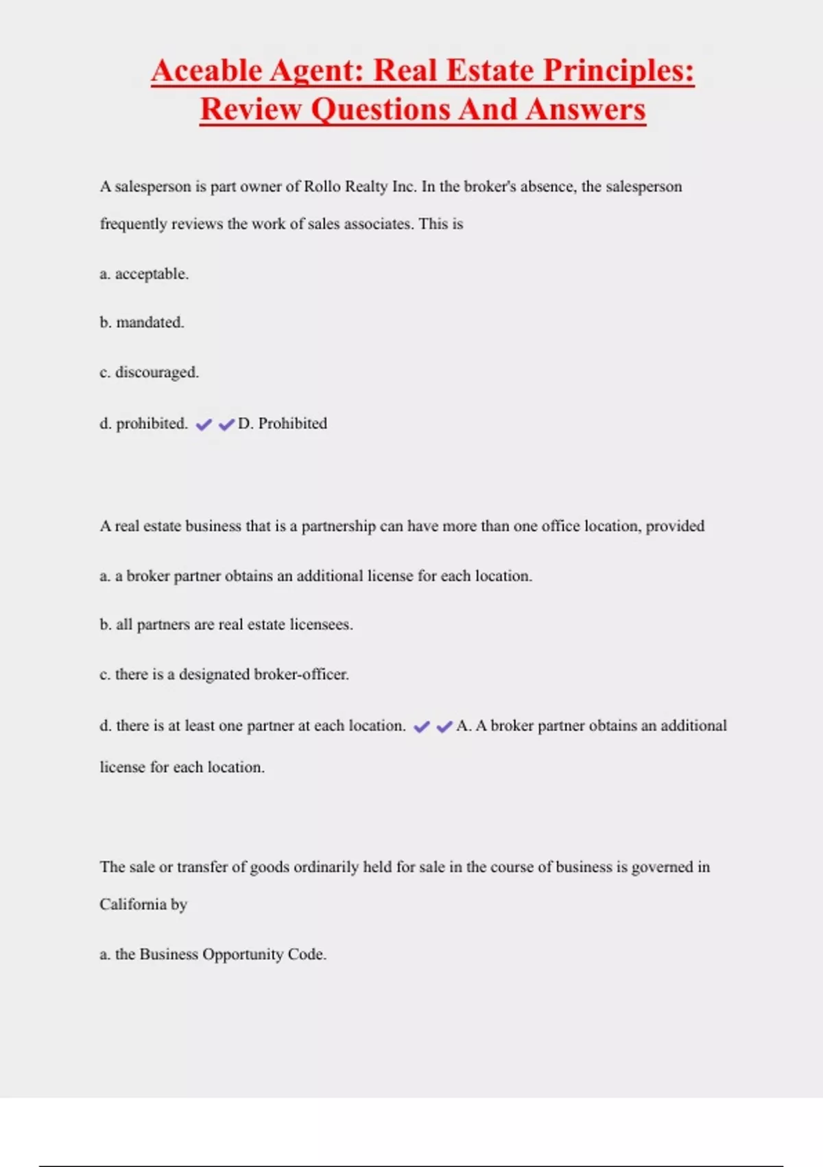 Aceable Agent: Real Estate Principles: Review Questions And Answers A salesperson is part owner of Rollo Realty Inc. In the broker's absence, the salesperson frequently reviews the work of sales associates. This is a. acceptable. b. mandated. c. discouraged. d. prohibited. D. Prohibited A real estate business that is a partnership can have more than one office location, provided a. a broker partner obtains an additional license for each location. b. all partners are real estate licensees. c. there is a designated broker-officer. d. there is at least one partner at each location. A. A broker partner obtains an additional license for each location