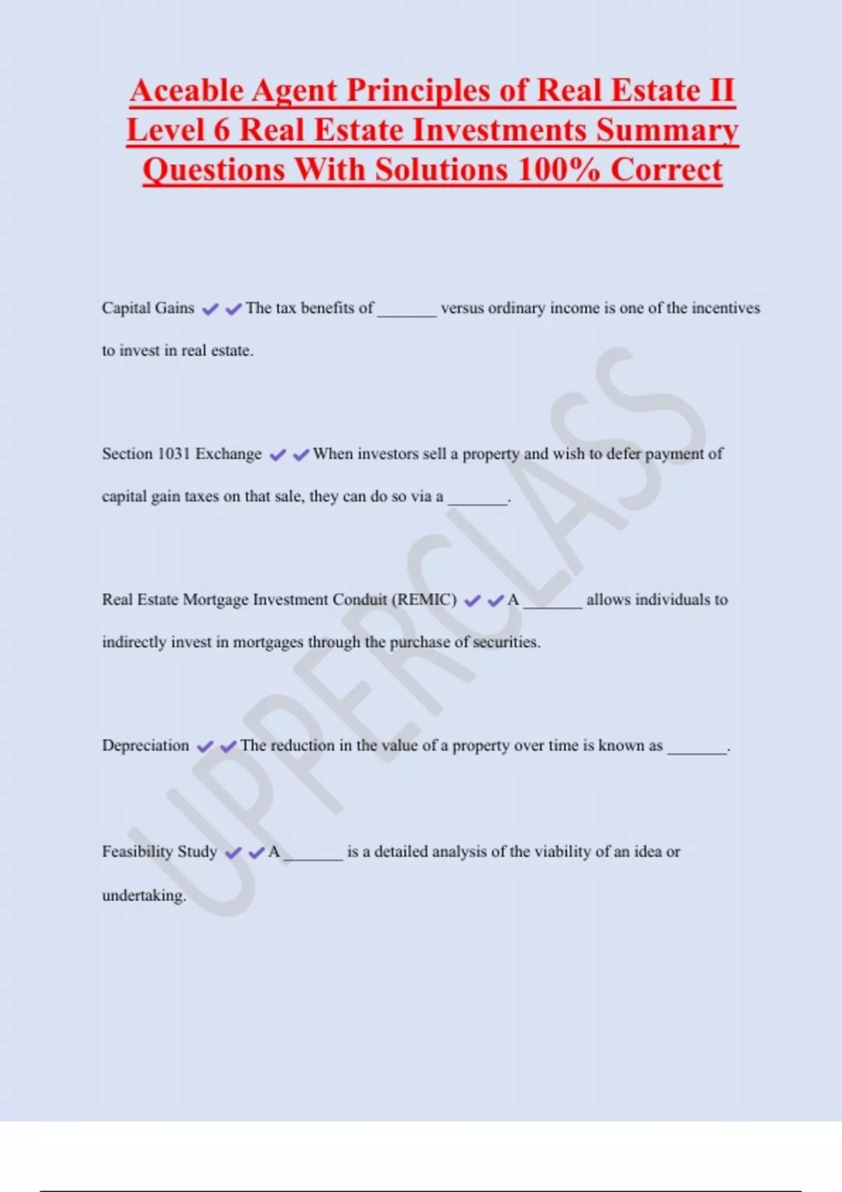 Aceable Agent Principles of Real Estate II Level 6 Real Estate Investments Summary Questions With Solutions 100% Correct Capital Gains The tax benefits of _______ versus ordinary income is one of the incentives to invest in real estate. Section 1031 Exchange When investors sell a property and wish to defer payment of capital gain taxes on that sale, they can do so via a _______. Real Estate Mortgage Investment Conduit (REMIC) A _______ allows individuals to indirectly invest in mortgages through the purchase of securities. Depreciation The reduction in the value of a property over time is known as _______.