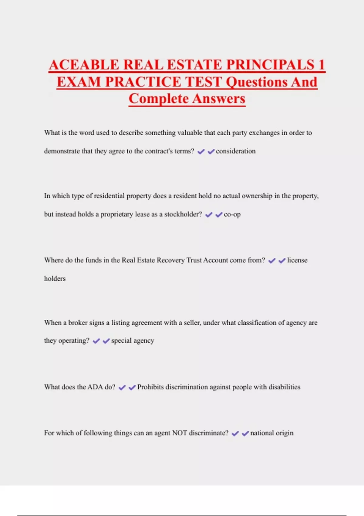 ACEABLE REAL ESTATE PRINCIPALS 1 EXAM PRACTICE TEST Questions And Complete Answers What is the word used to describe something valuable that each party exchanges in order to demonstrate that they agree to the contract's terms? consideration In which type of residential property does a resident hold no actual ownership in the property, but instead holds a proprietary lease as a stockholder? co-op Where do the funds in the Real Estate Recovery Trust Account come from? license holders When a broker signs a listing agreement with a seller, under what classification of agency are they operating? special agency