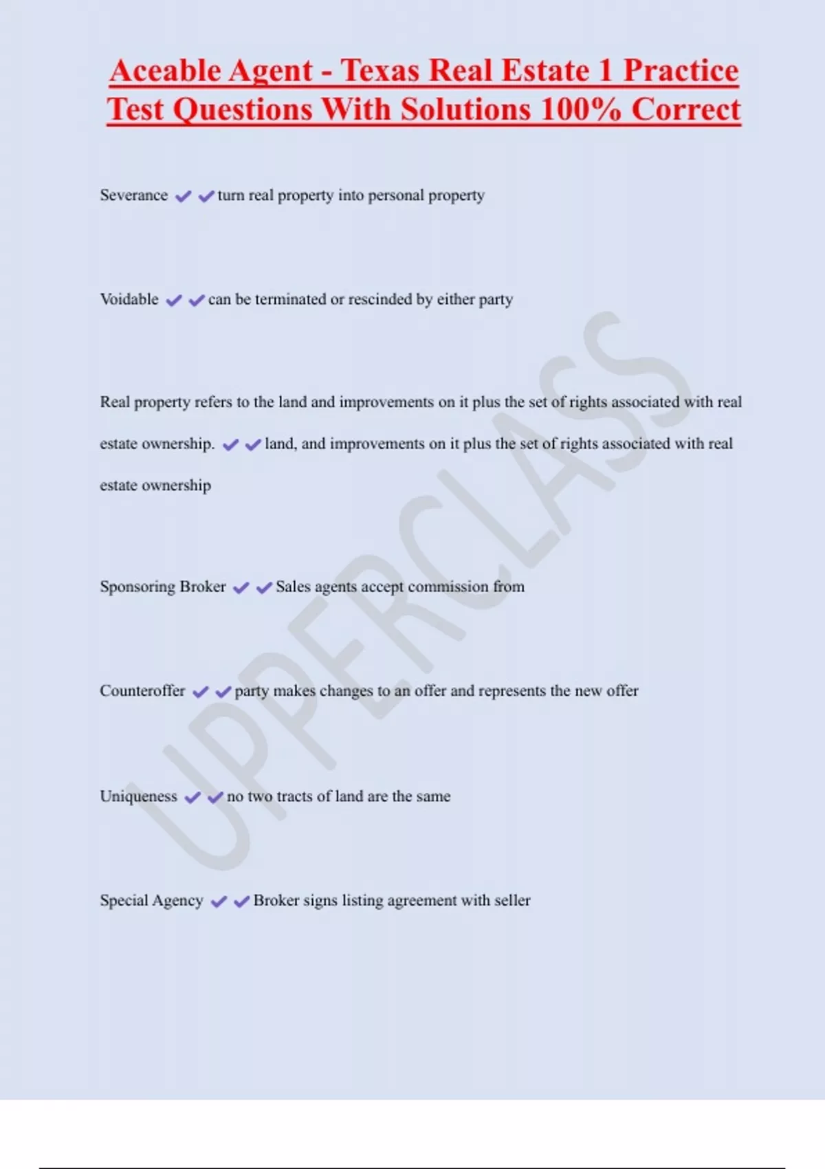 Aceable Agent - Texas Real Estate 1 Practice Test Questions With Solutions 100% Correct Severance turn real property into personal property Voidable can be terminated or rescinded by either party Real property refers to the land and improvements on it plus the set of rights associated with real estate ownership. land, and improvements on it plus the set of rights associated with real estate ownership Sponsoring Broker Sales agents accept commission from Counteroffer party makes changes to an offer and represents the new offer Uniqueness no two tracts of land are the same