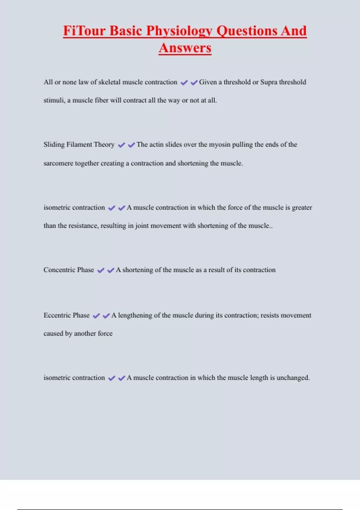 FiTour Basic Physiology Questions And Answers All or none law of skeletal muscle contraction Given a threshold or Supra threshold stimuli, a muscle fiber will contract all the way or not at all. Sliding Filament Theory The actin slides over the myosin pulling the ends of the sarcomere together creating a contraction and shortening the muscle. isometric contraction A muscle contraction in which the force of the muscle is greater than the resistance, resulting in joint movement with shortening of the muscle.. Concentric Phase A shortening of the muscle as a result of its contraction Eccentric Phase A lengthening of the muscle during its contraction; resists movement caused by another force